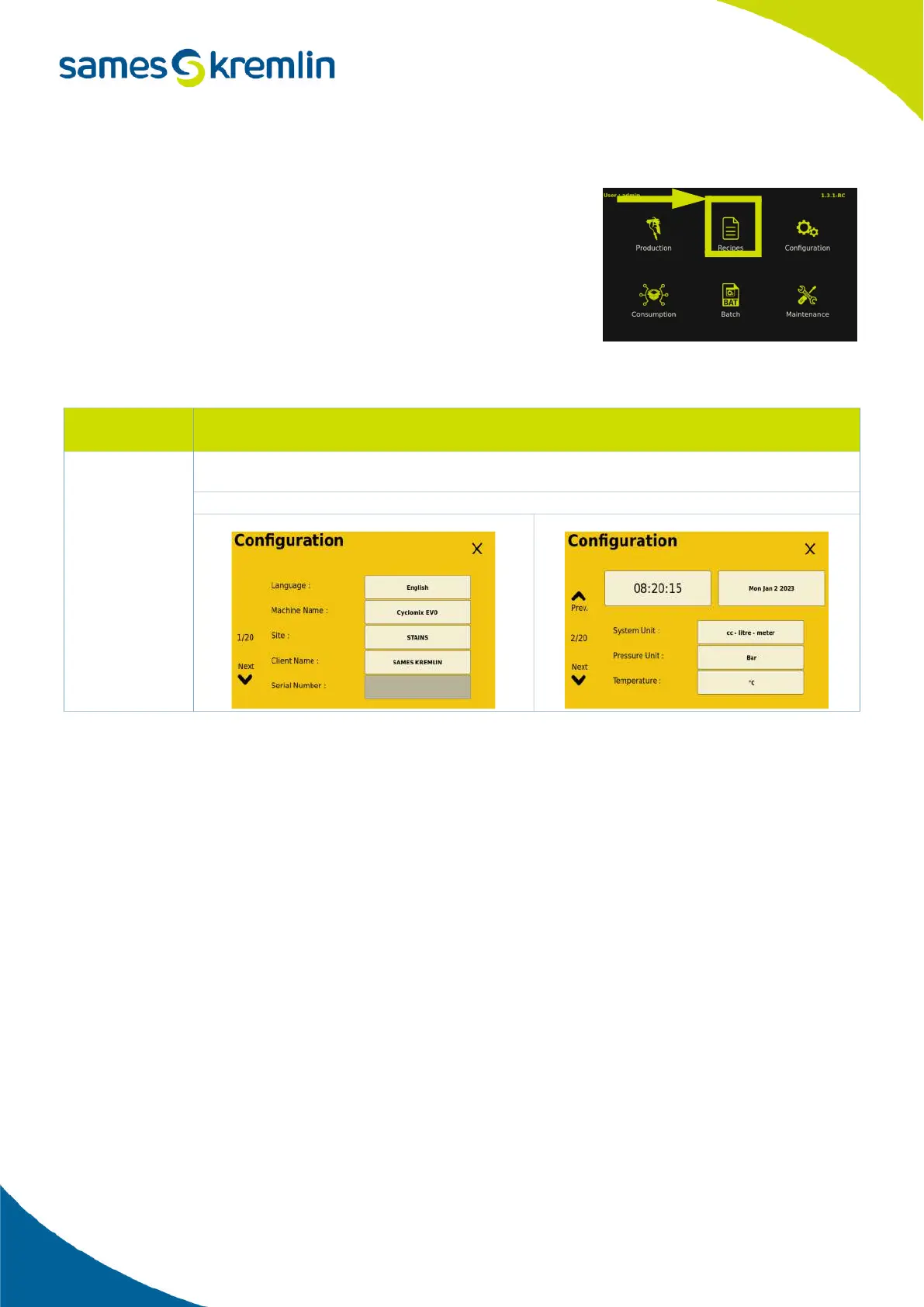 SAMES KREMLIN Cyclomix Evo - Configuring the Cyclomix Evo - General Settings