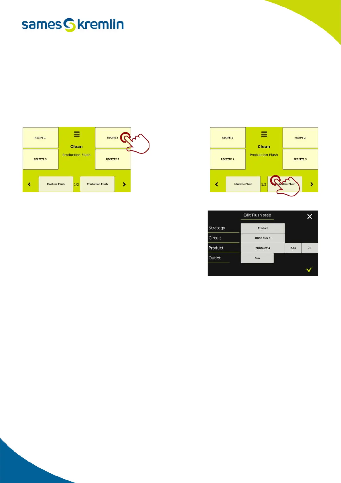 • Manually by pressing the Production Flushing button on the recipe selection page.