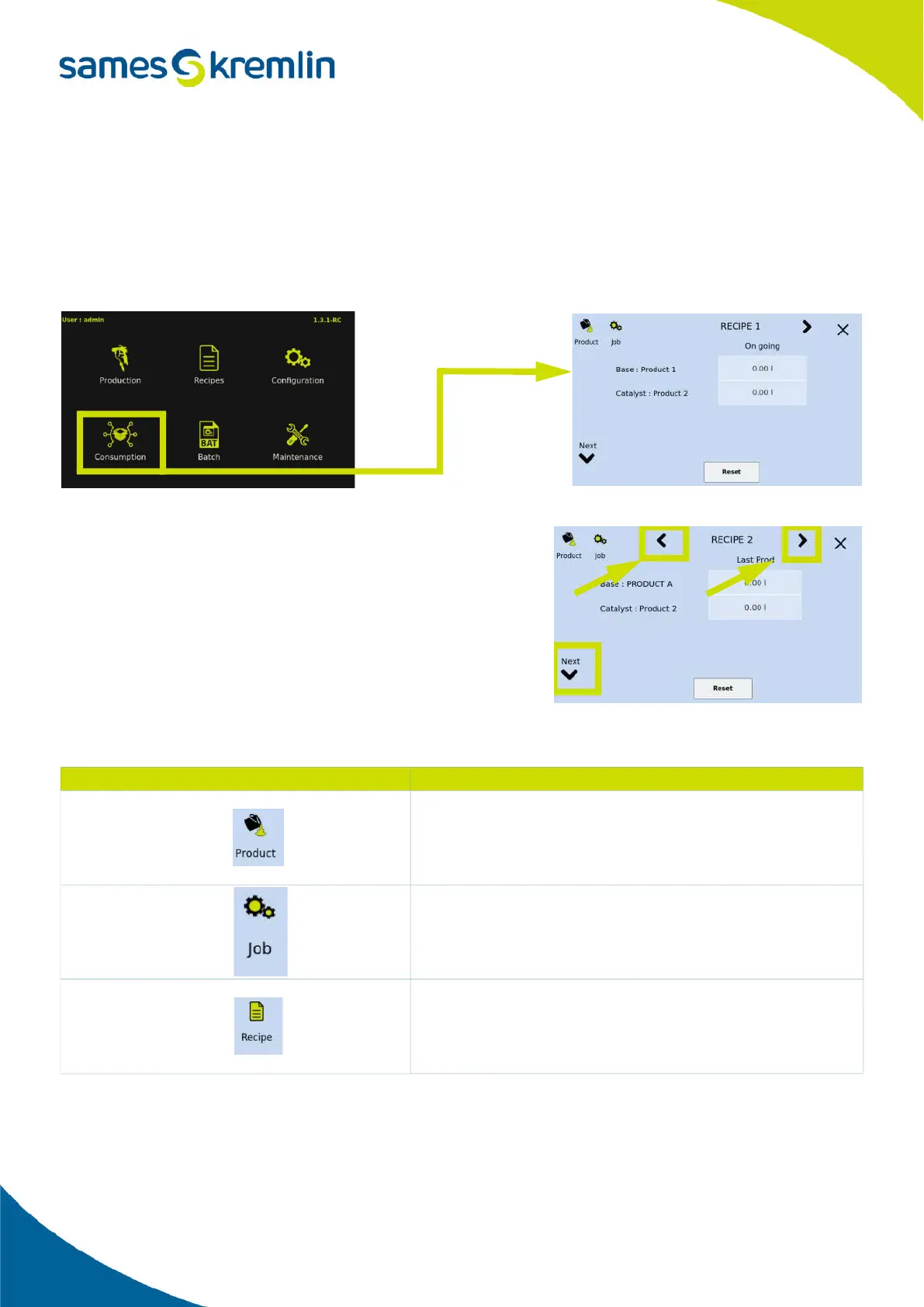 This icon allows you to access the consumption by recipe and thus