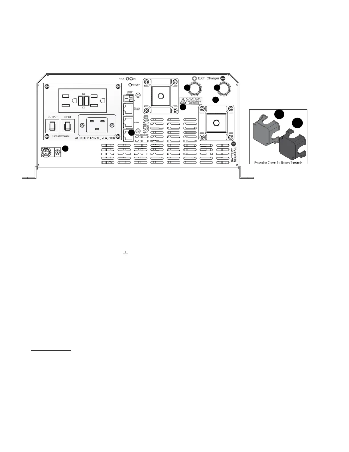 Deep cycle batteries are connected to the battery input terminals (1) and (2). The terminals are provided with