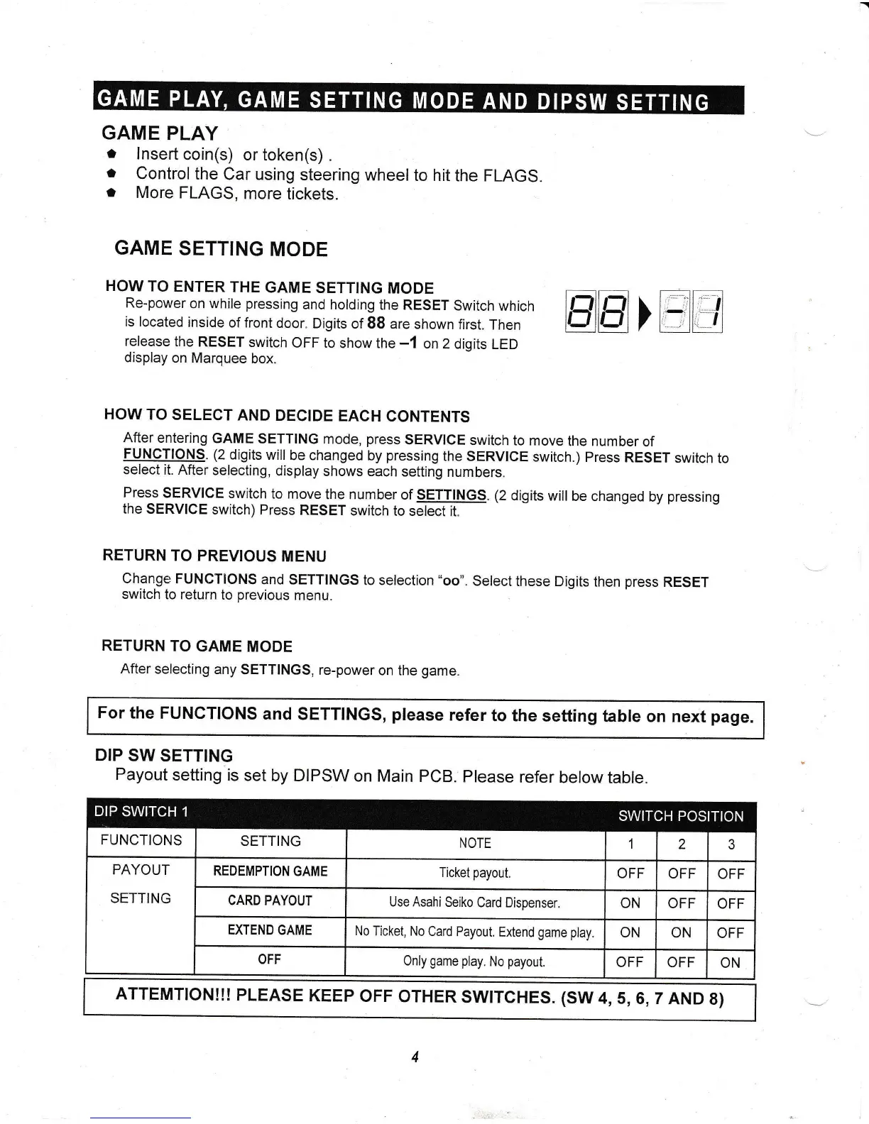 Sammy Mighty Driver - GAME MODES AND SETTINGS; Gameplay and Setting Mode Navigation; DIP Switch Configuration