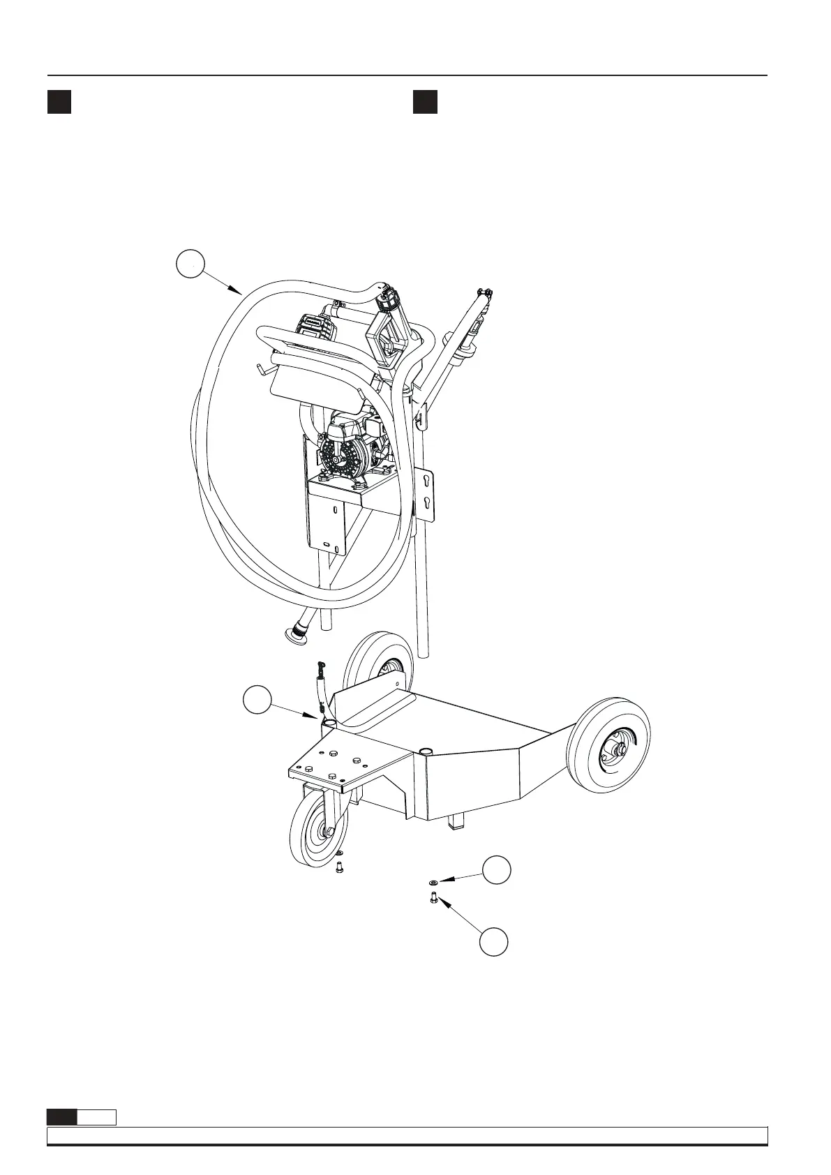 Fix handlebar (1) to the cart base (2) by using screws (3) and washers