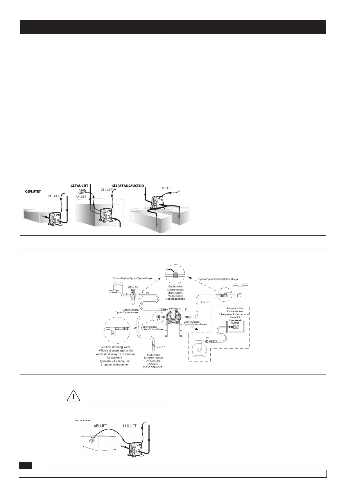 Die Zeichnung unten zeigt die empfohlene Konfiguration für die Installation einer Membranpumpe. Lesen Sie die Warnhinweise und Empfehlungen