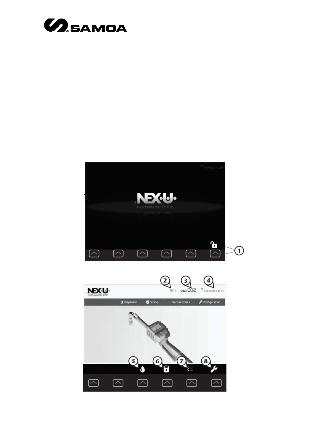 identifier (3), the date and time (4), and the available menus: dispense (5), stocks (6),