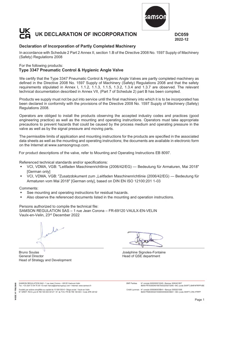 We certify that the Type 3347 Pneumatic Control & Hygienic Angle Valves are partly completed machinery as