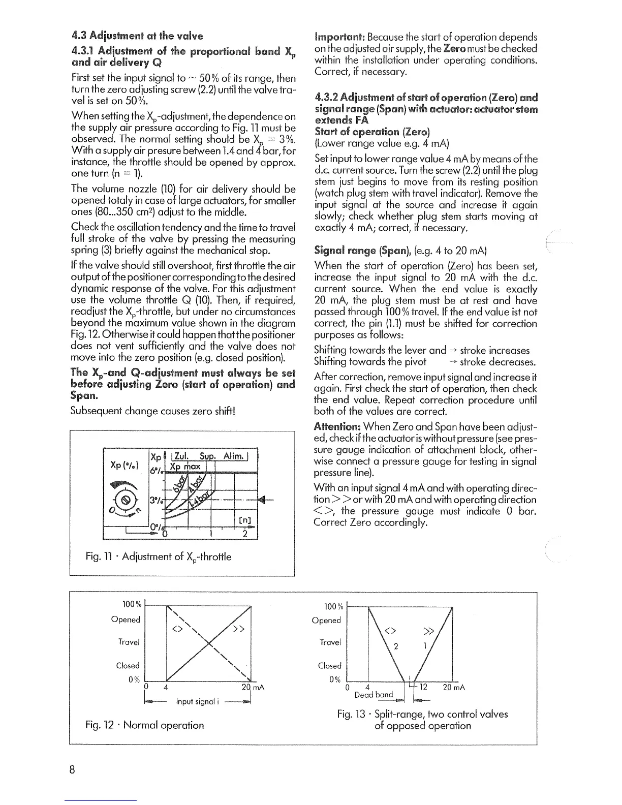 Samson 763 - Adjustment at the Valve; Adjustment of the Proportional Band Xp and Air Delivery Q; Adjustment of Start of Operation and Signal Range (Span) W. Actuator; Signal Range (Span)