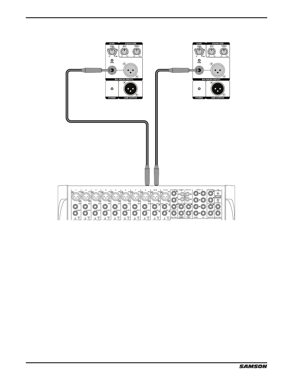 • Using standard XLR or 1/4” cables, connect the line level signals from a mixer or keyboard into the