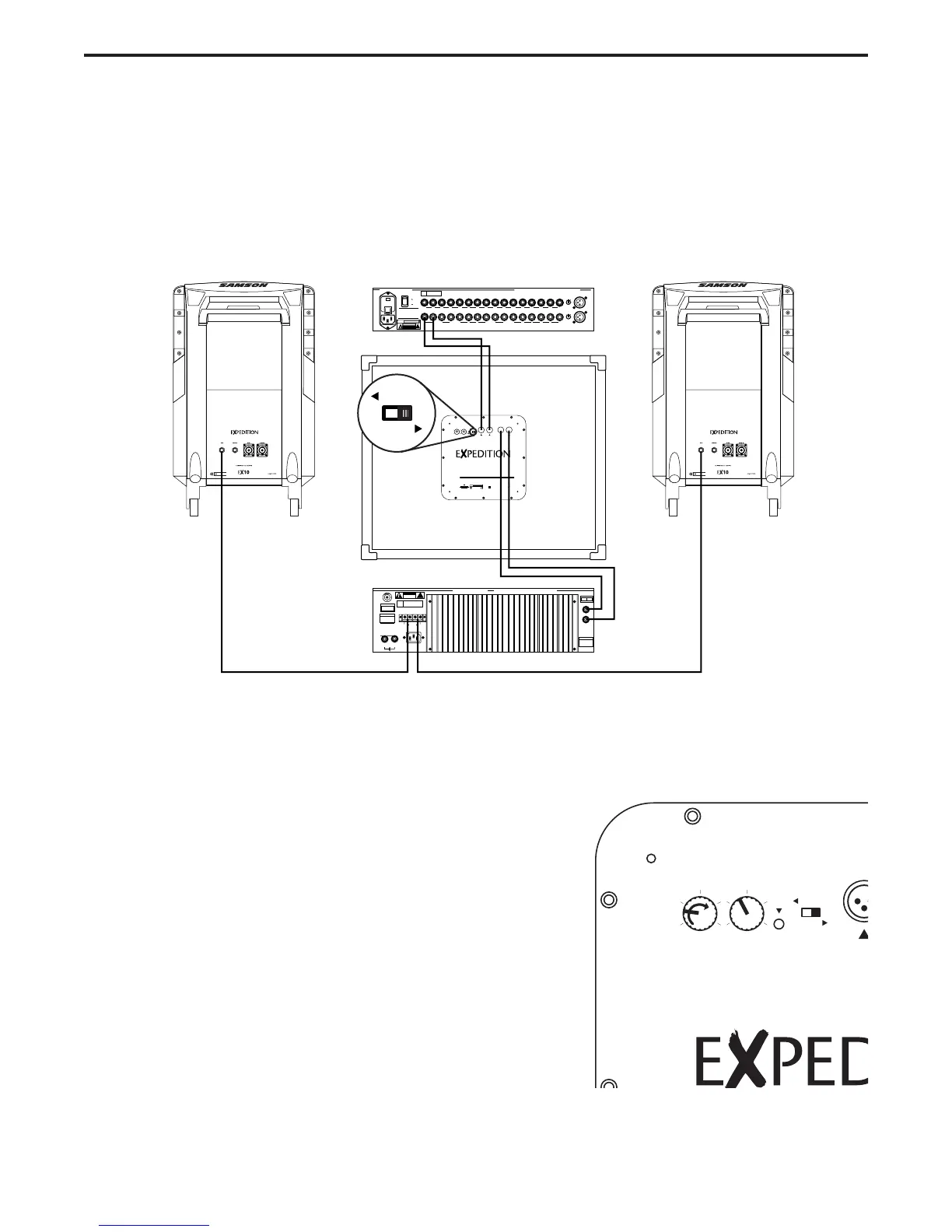 If your system uses a standard stereo power amp and passive full range enclosures, like the Samson EX10, the