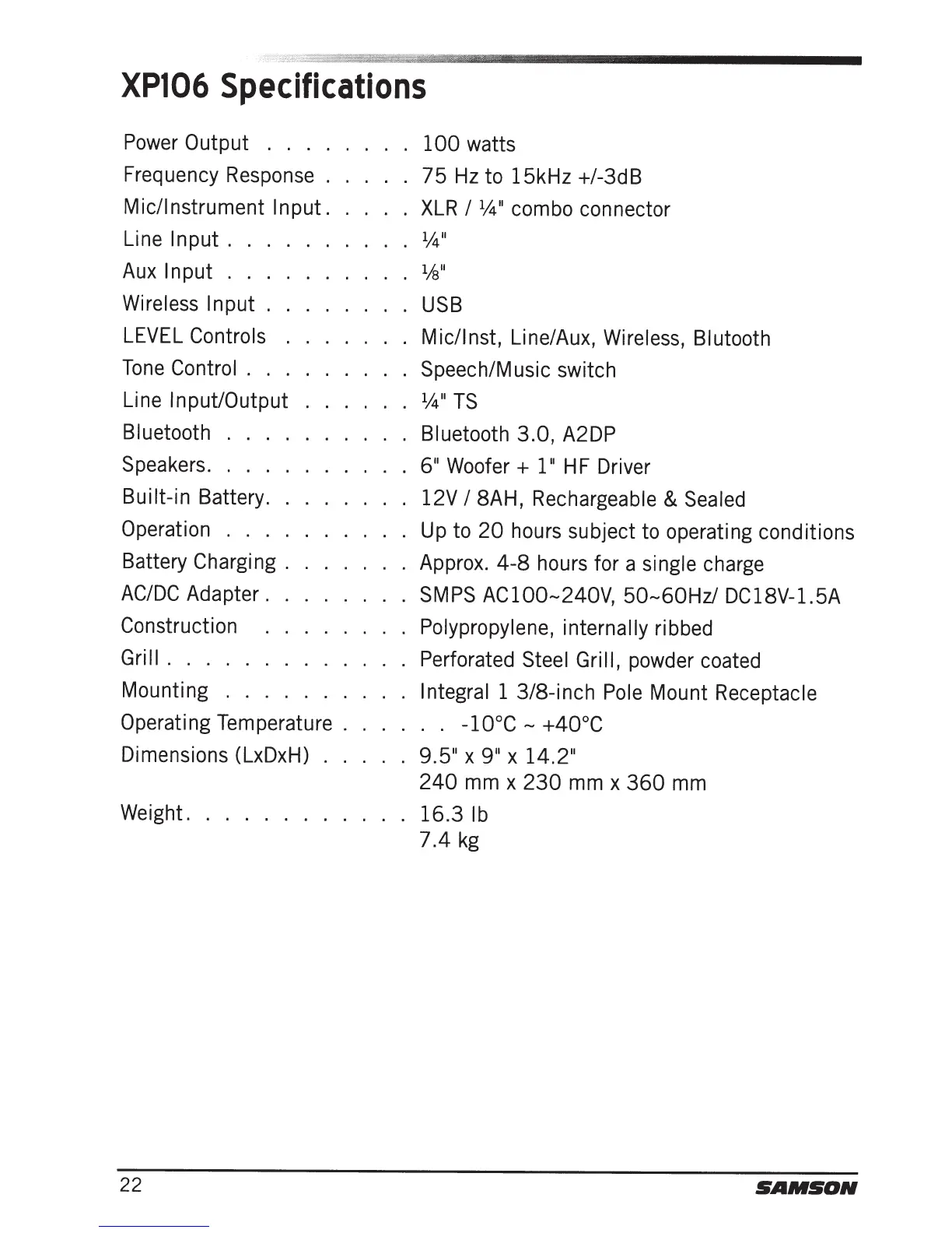Samson Expedition XP106 - XP106 Specifications