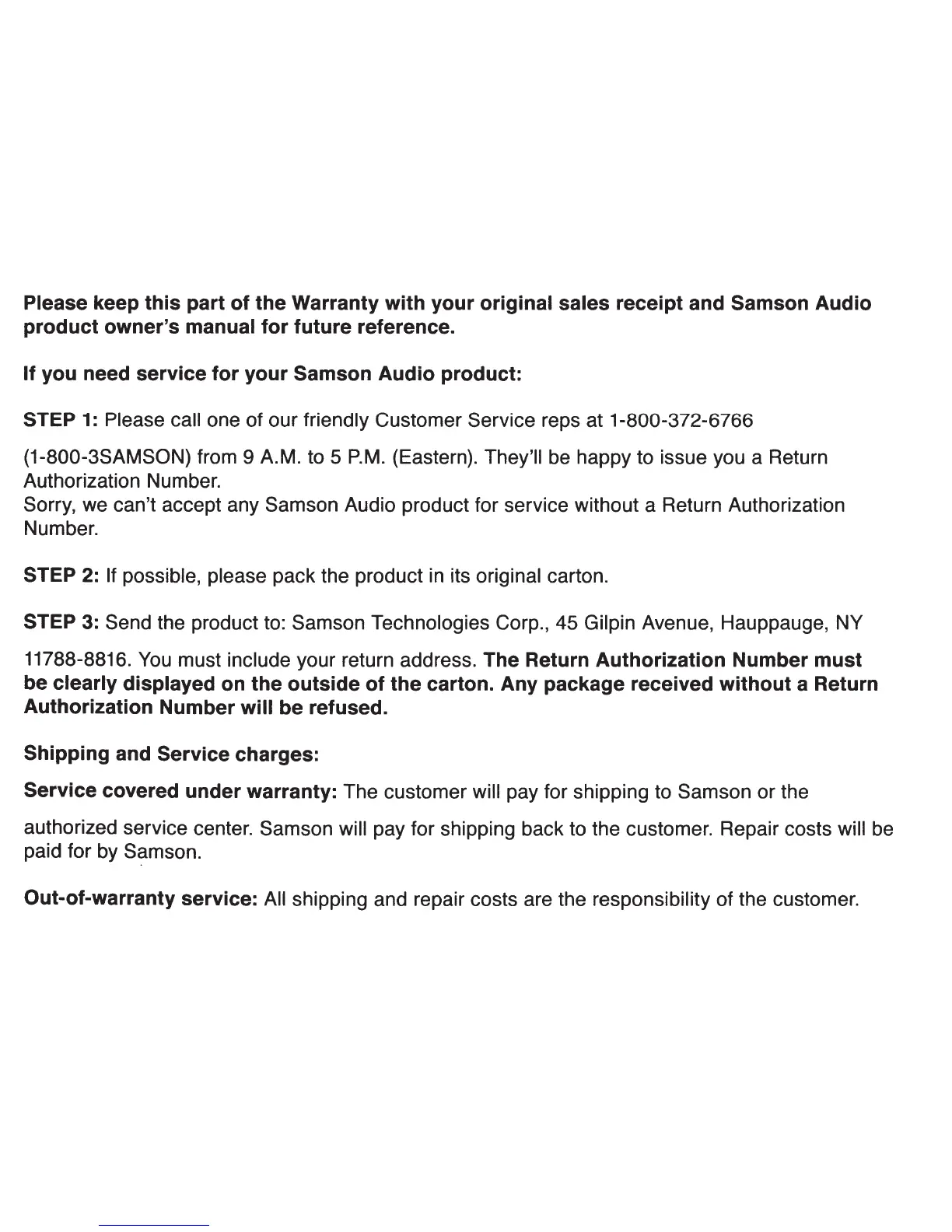 STEP 3: Send the product to: Samson Technologies Corp., 45 Gilpin Avenue, Hauppauge, NY