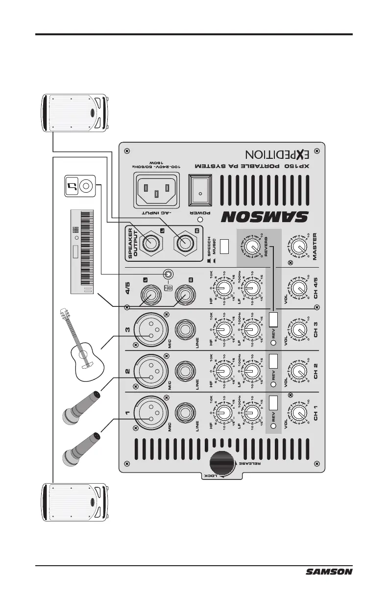 This example shows a typical PA system for a cocktail band using the XP150 with two microphones, acoustic guitar, and keyboards, and