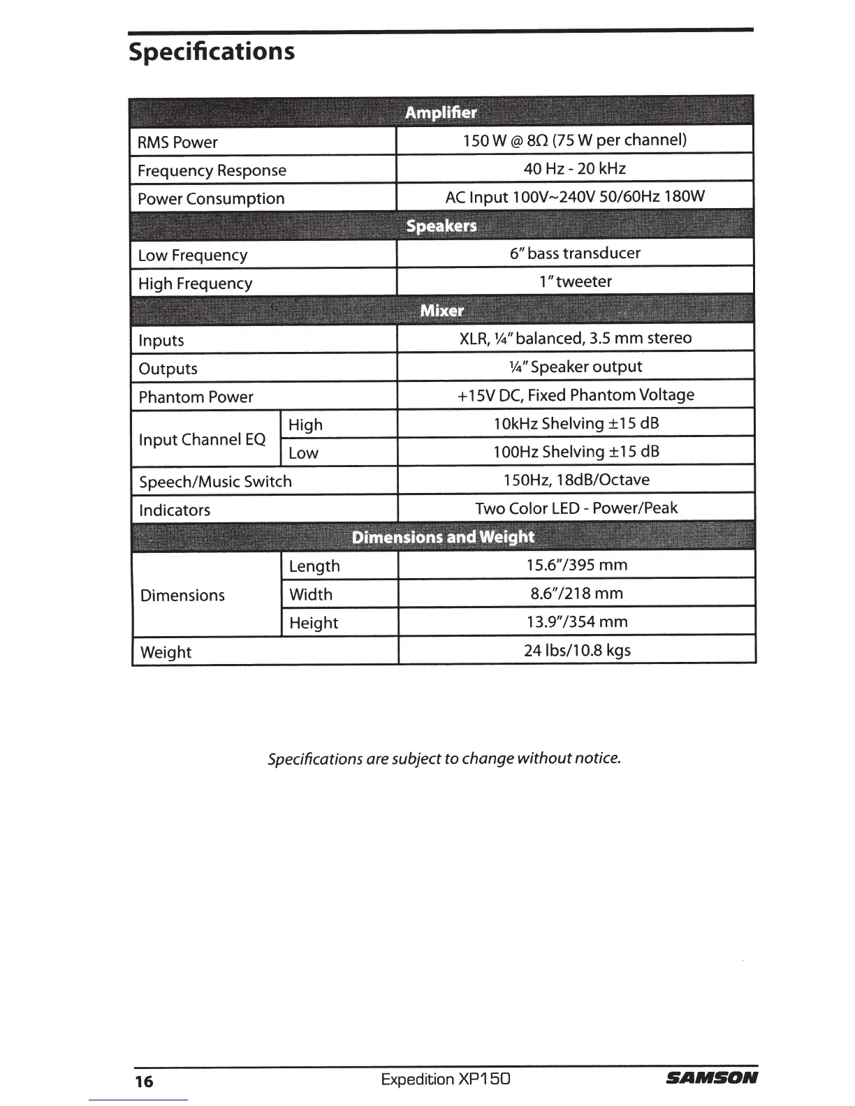 Samson Expeditionn XP150 - Specifications