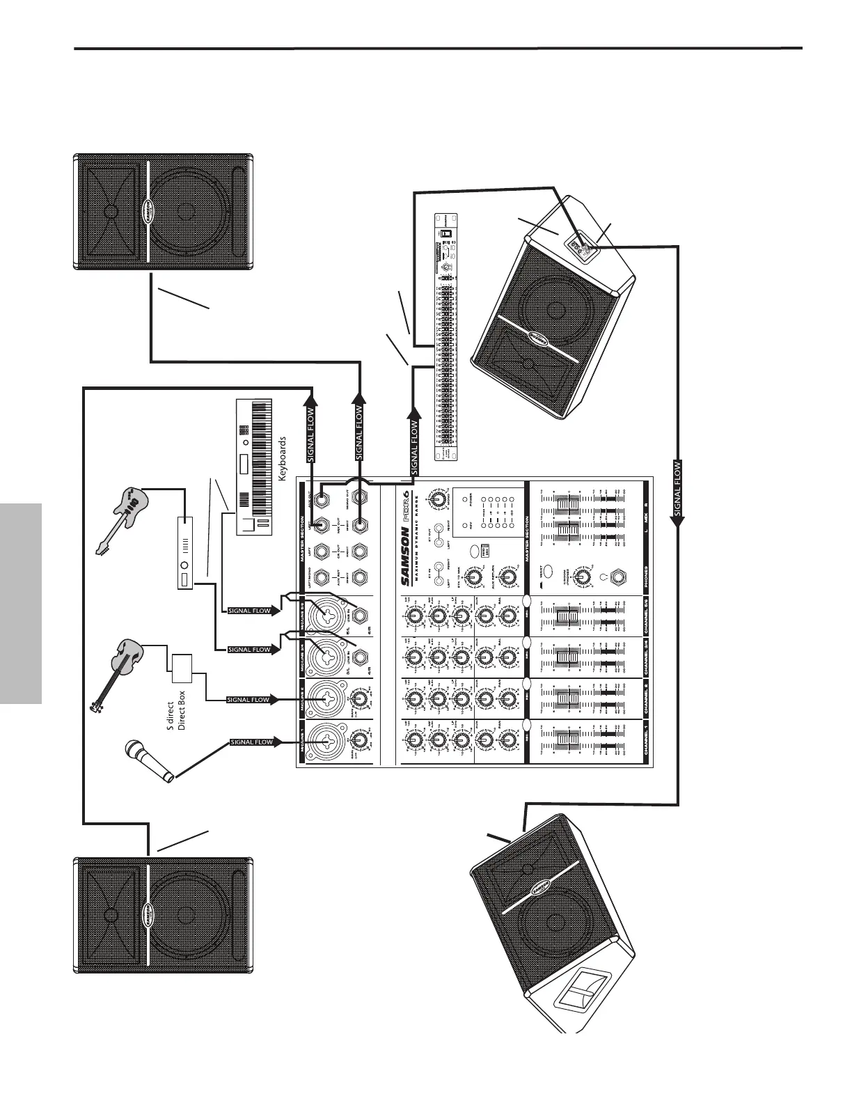 Dieses Beispiel zeigt ein typisches PA-System mit einem Mischer und einem Paar Live-Serie-Boxen für die linke und rechte