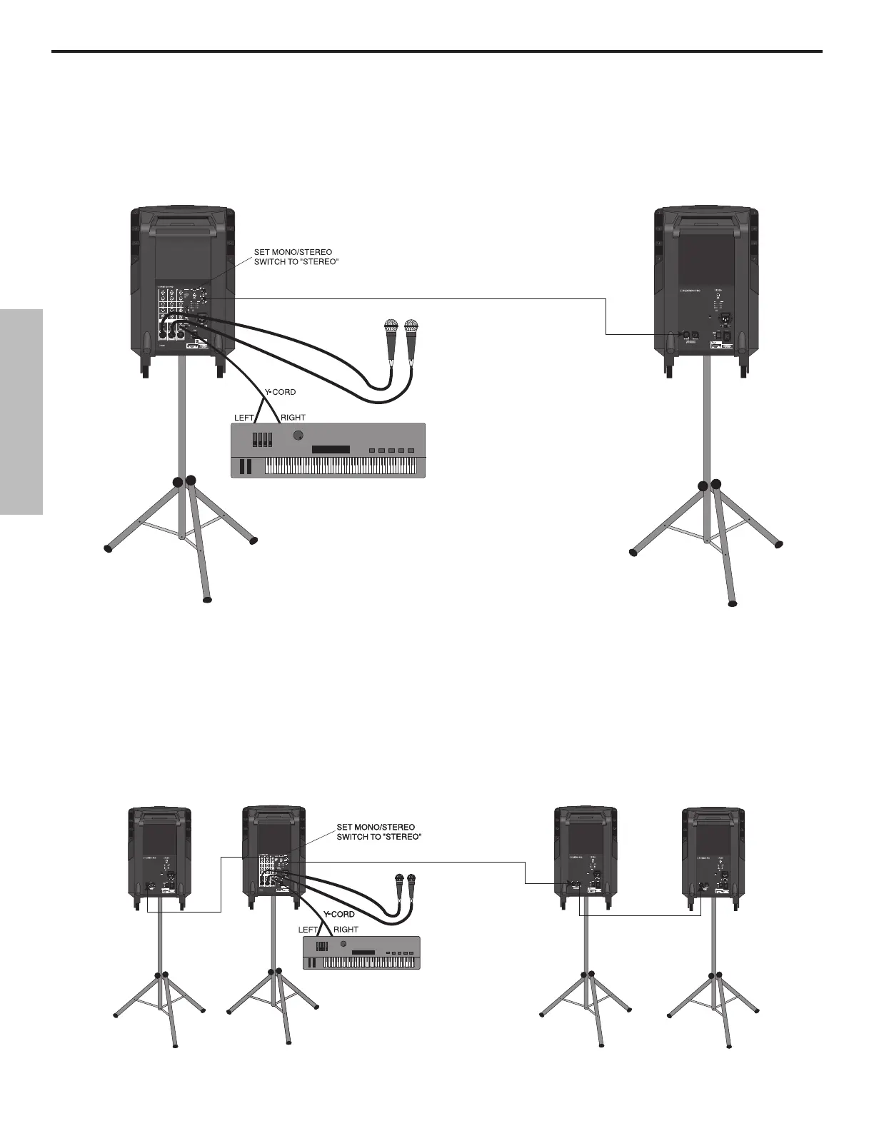 Emploi d'une XP300 et d'une XP200 (configuration stéréo) : Dans cet exemple, reliez les microphones aux entrées micro XLR