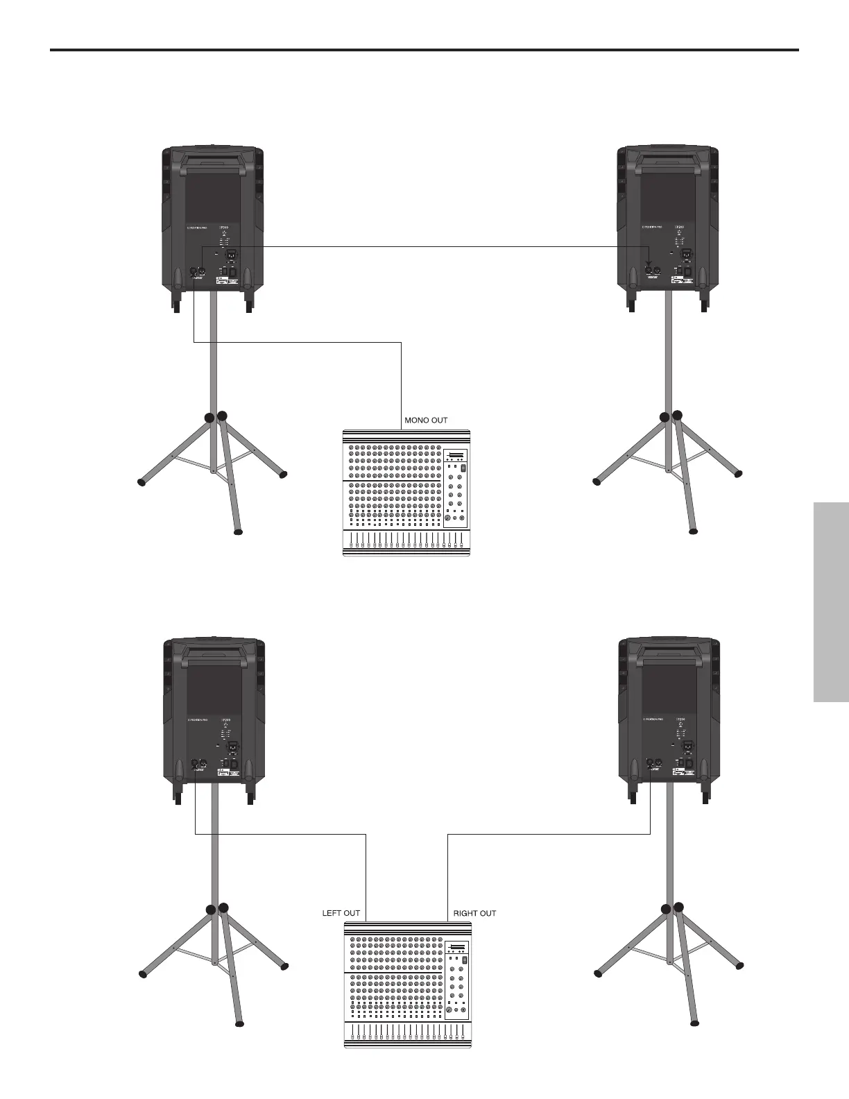 Mono-Betrieb zweier XP200: Ein einzelnes Mono-Signal (Bus oder Aux-Send) geht vom Mischer zum XLR-Eingang des XP200.