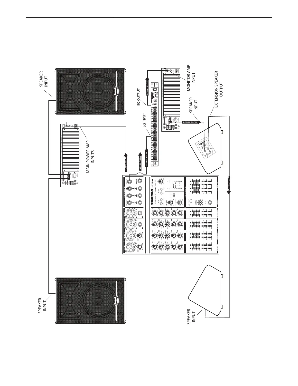 This example shows a typical PA system using a mixer with an external power amplifier and a pair of Resound HDs for the main left