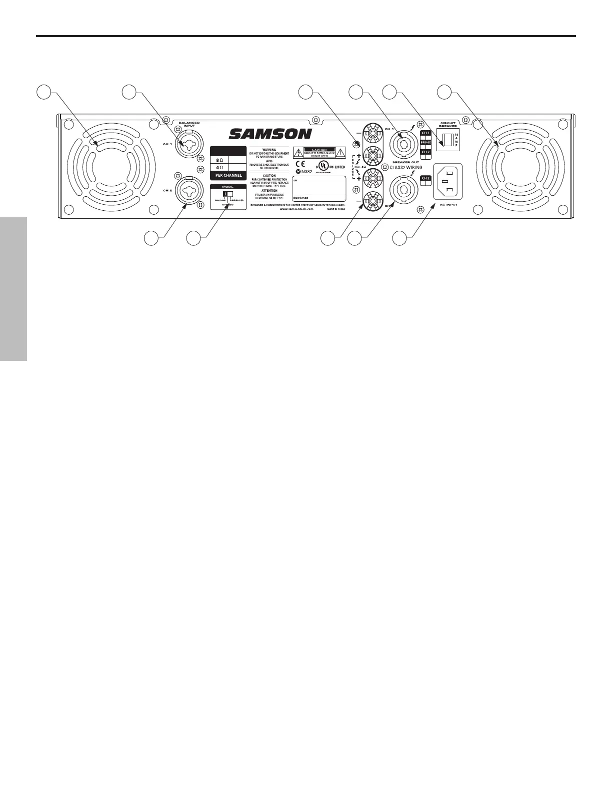 4 : Connecteurs Speakon™ - Vous pouvez aussi utiliser ces embases pour connecter chaque canal de l'amplificateur à vos encein