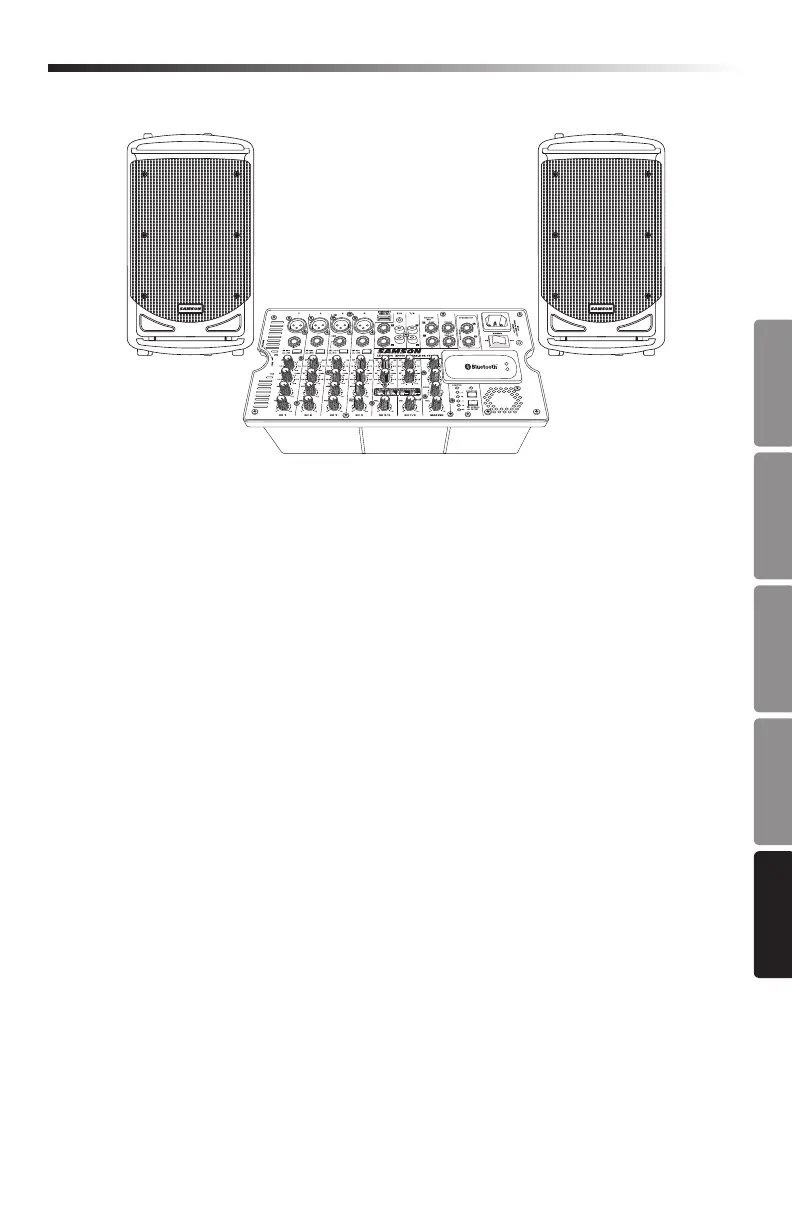 • Il mixer può essere riposto sul retro di uno dei due altoparlanti; l'altro altoparlante è