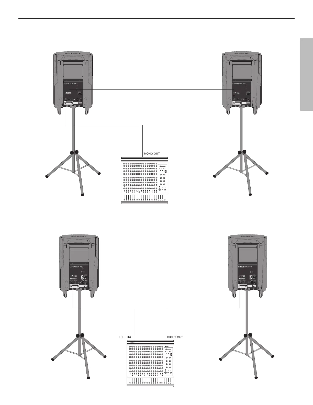 Using two XPL200s in mono: A single mono signal (bus or aux send) is routed from a mixer to one XPL200’s XLR input, and a