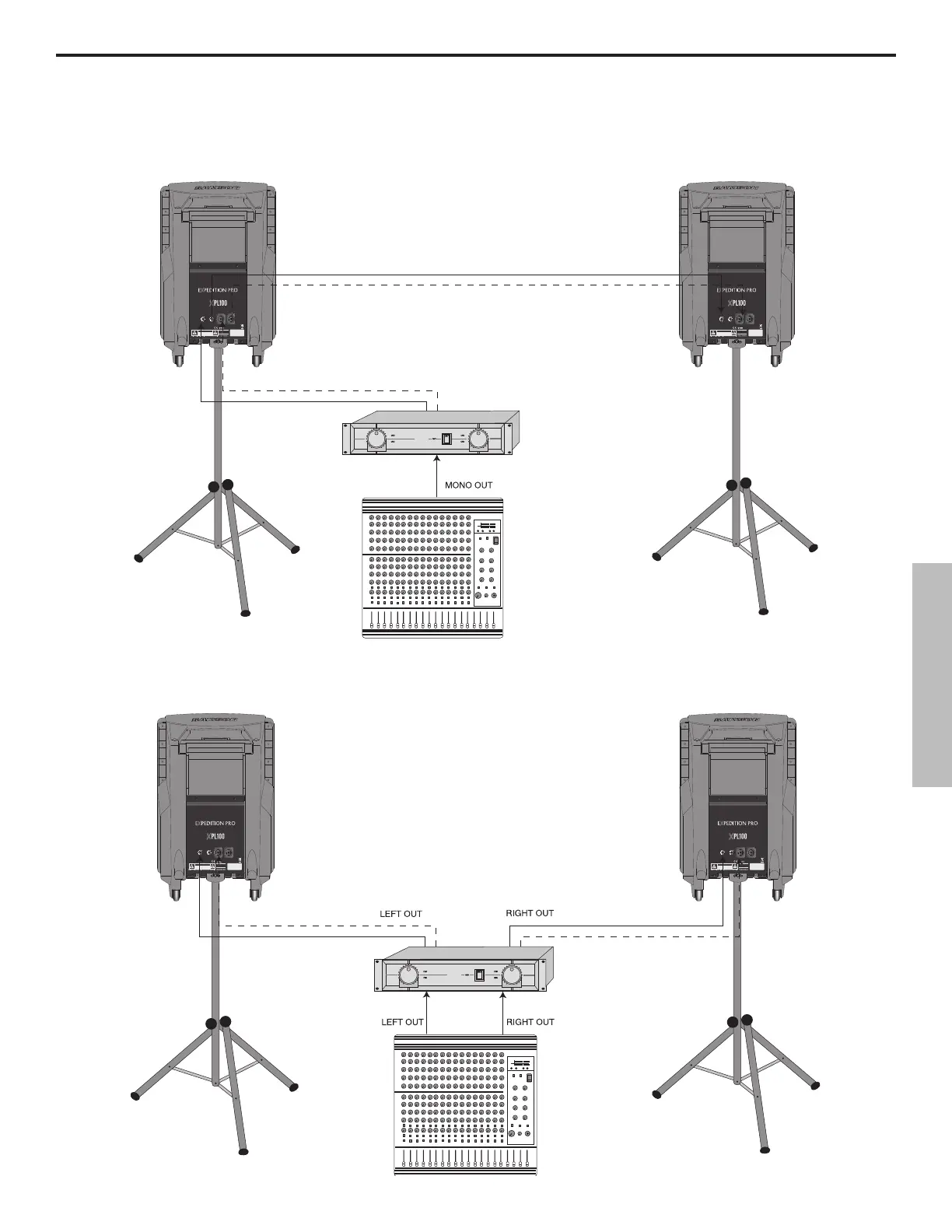 Mono-Betrieb zweier XPL100: Ein einzelnes Mono-Signal (Bus oder Aux-Send) geht vom Mischer zum Verstärker. Dann einen der