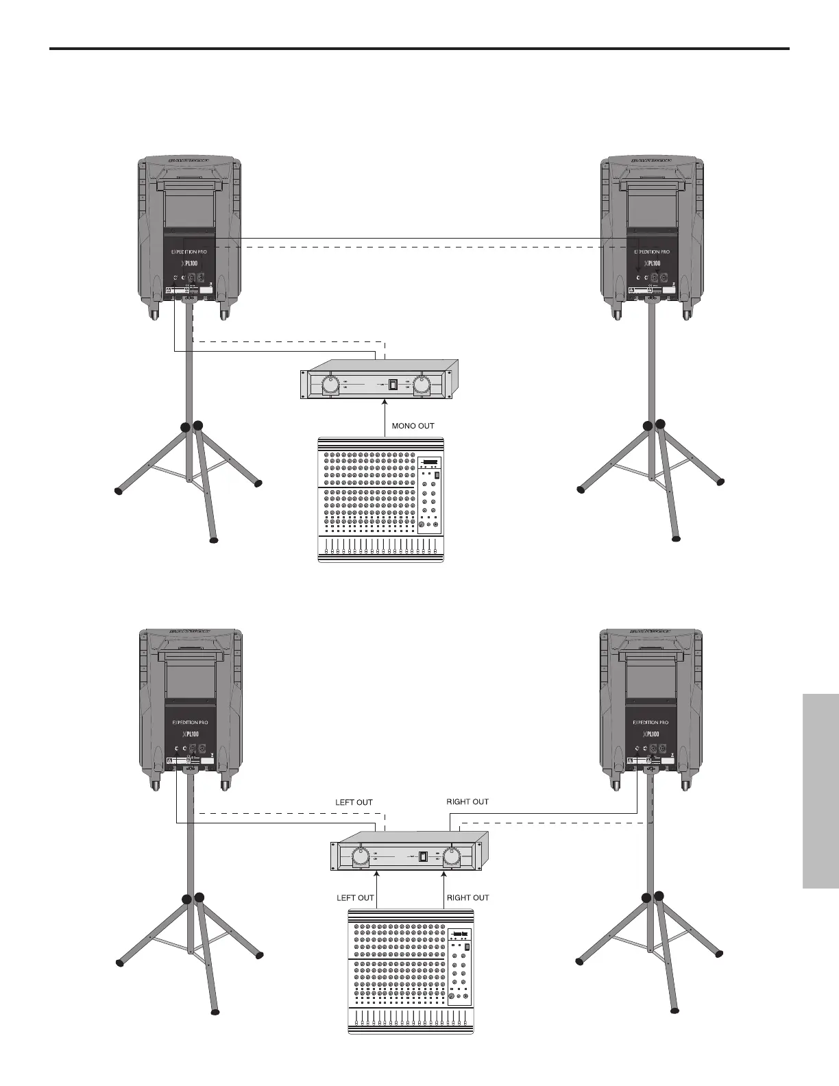 Uso de dos XPL100s en mono: Una única señal mono (bus o envío auxiliar) es enviada desde una mesa de mezclas a una etapa de potencia.