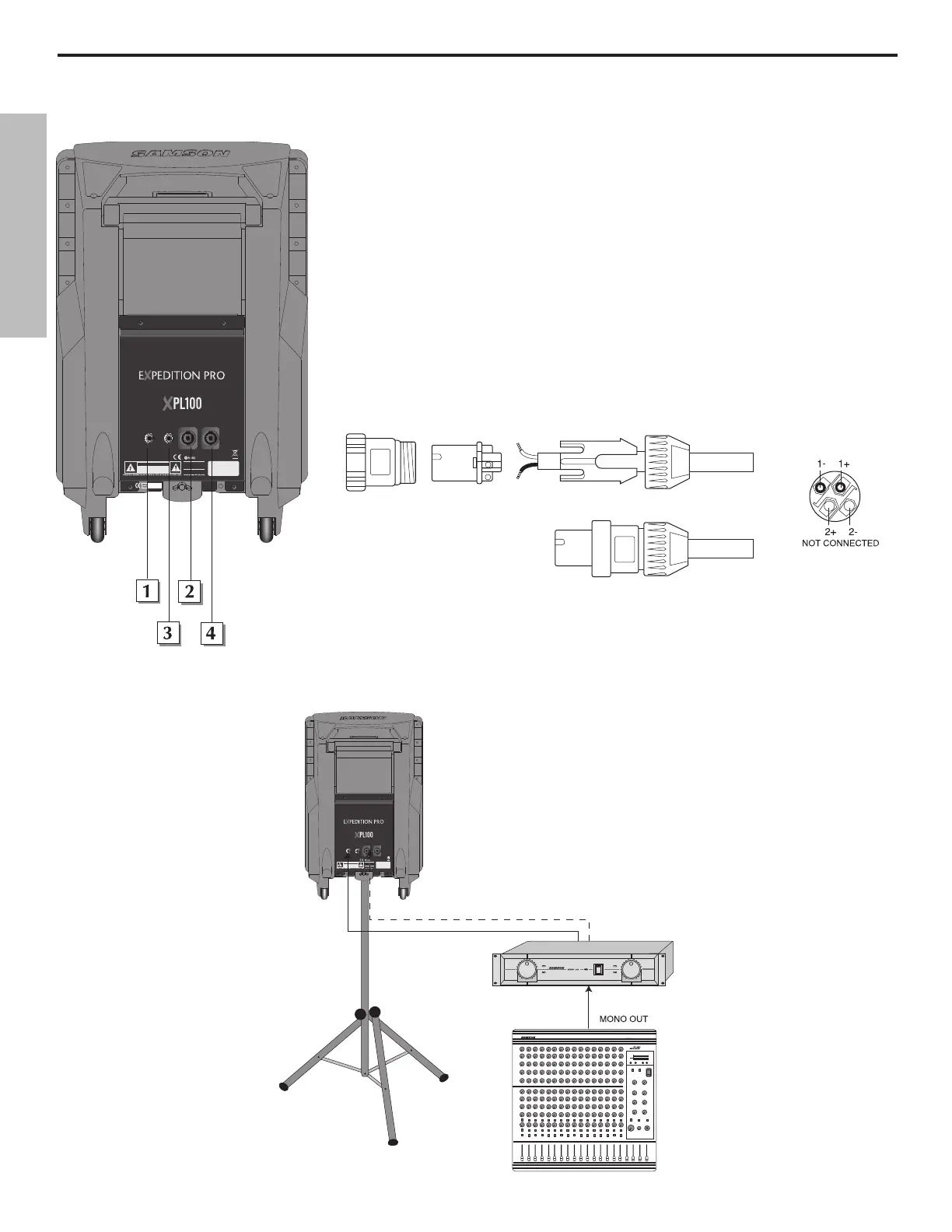 the XPL100 1/4" input connector (solid line) or Speakon™