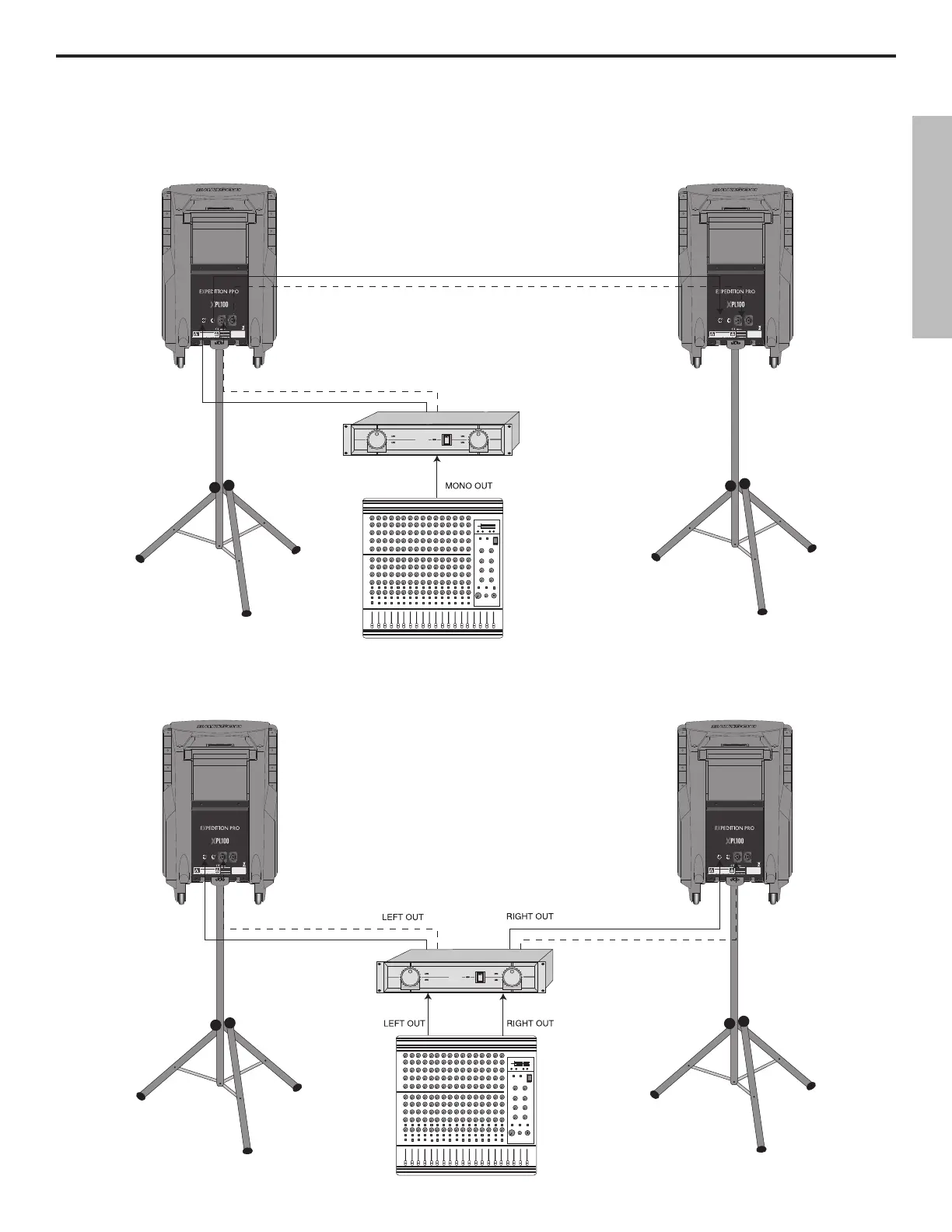 Using two XPL100s in mono: A single mono signal (bus or aux send) is routed from a mixer to a power amplifier. One speaker