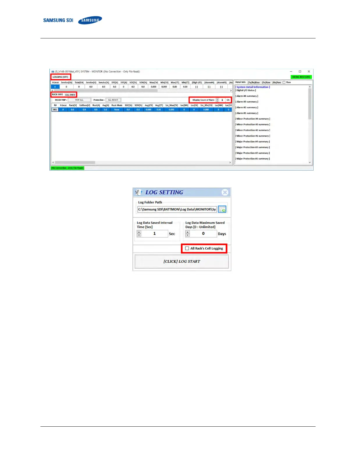 Check the box for all rack’s cell info log. Cell info is logged once every 30 seconds for each rack.