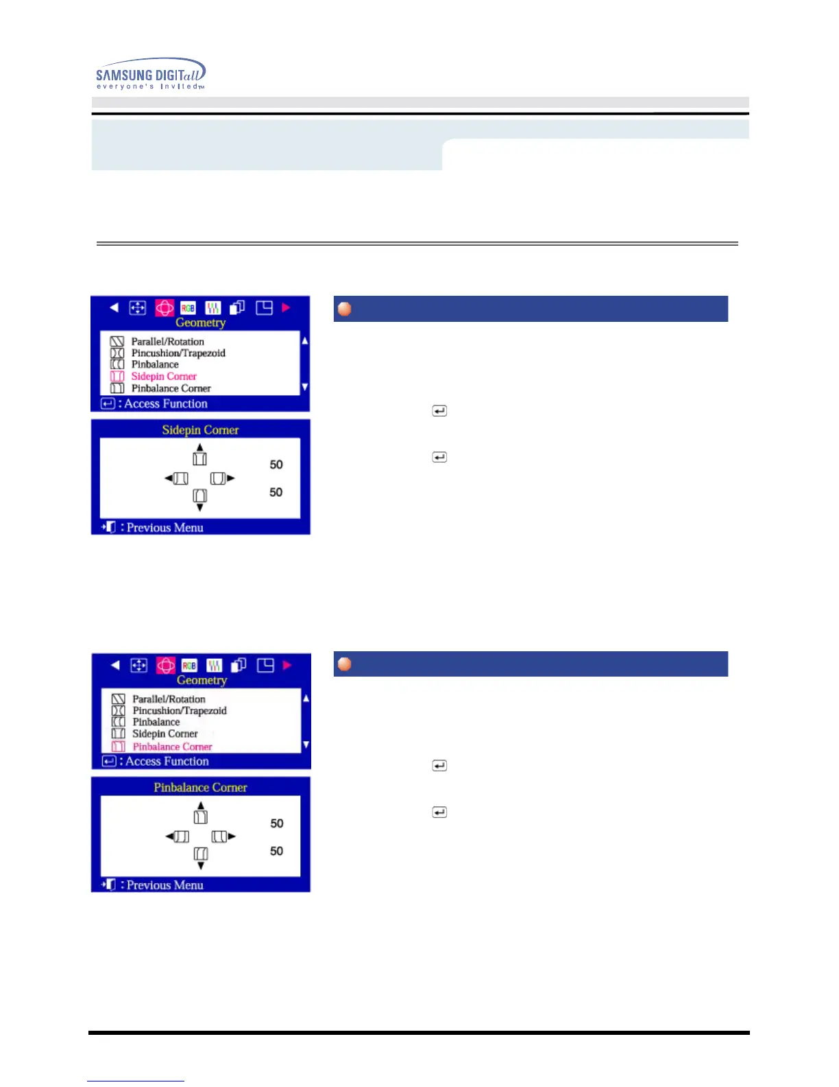 3 Push the Menu( ) button to open the Pinbalance Corner adjustment