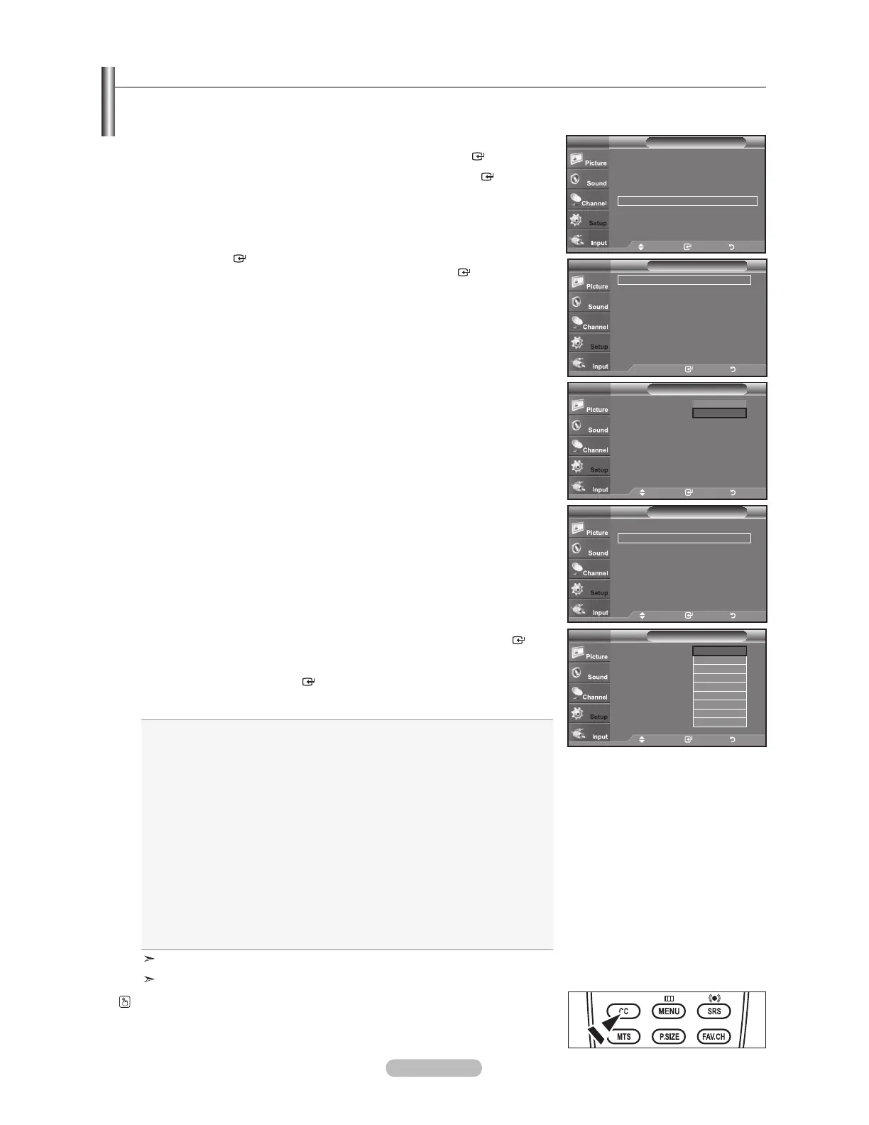 Press thePress the CC button on the remote control to turn the Caption “On” or “Off”.