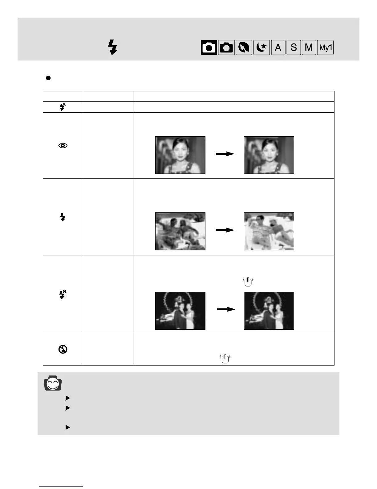 The flash does not fire. Select this mode when capturing images in a place or situation