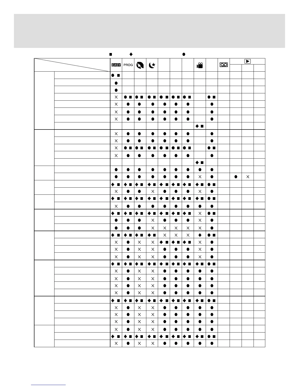 : Default, : After restarting the camera, : Selectable , X: Not Available, -: Not Selectable