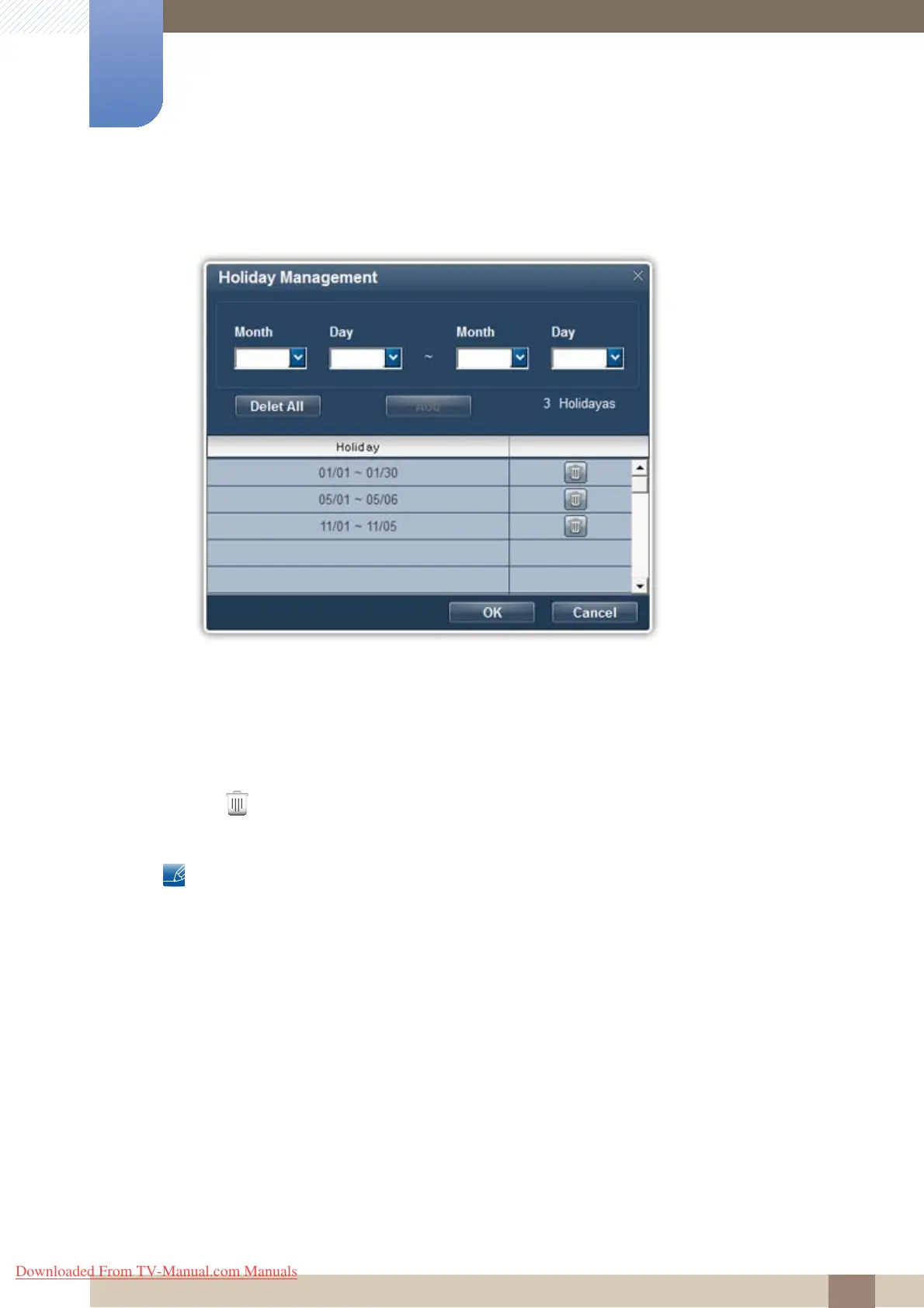 Holiday Management can be used to set the display not to turn on by the Timer on specified dates.