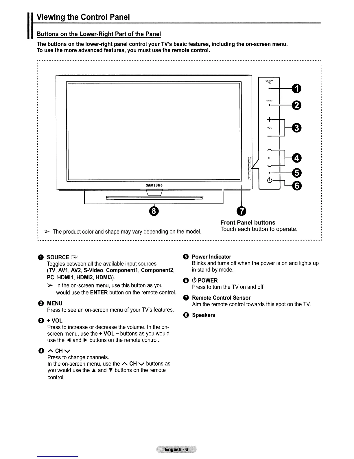 The buttons on the lower-right panel control your TV's basic features, including the on-screen menu.