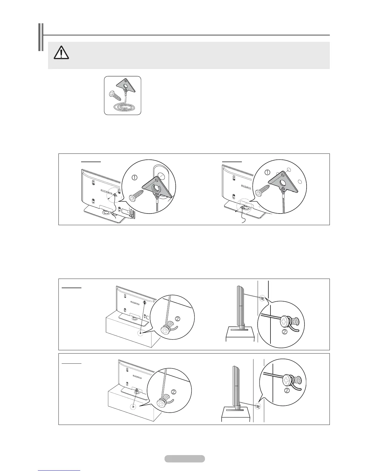 2. Firmly fasten the screws to the wall or cabinet where the TV is to be installed. Tie the TV-Holder attached to the TV and the