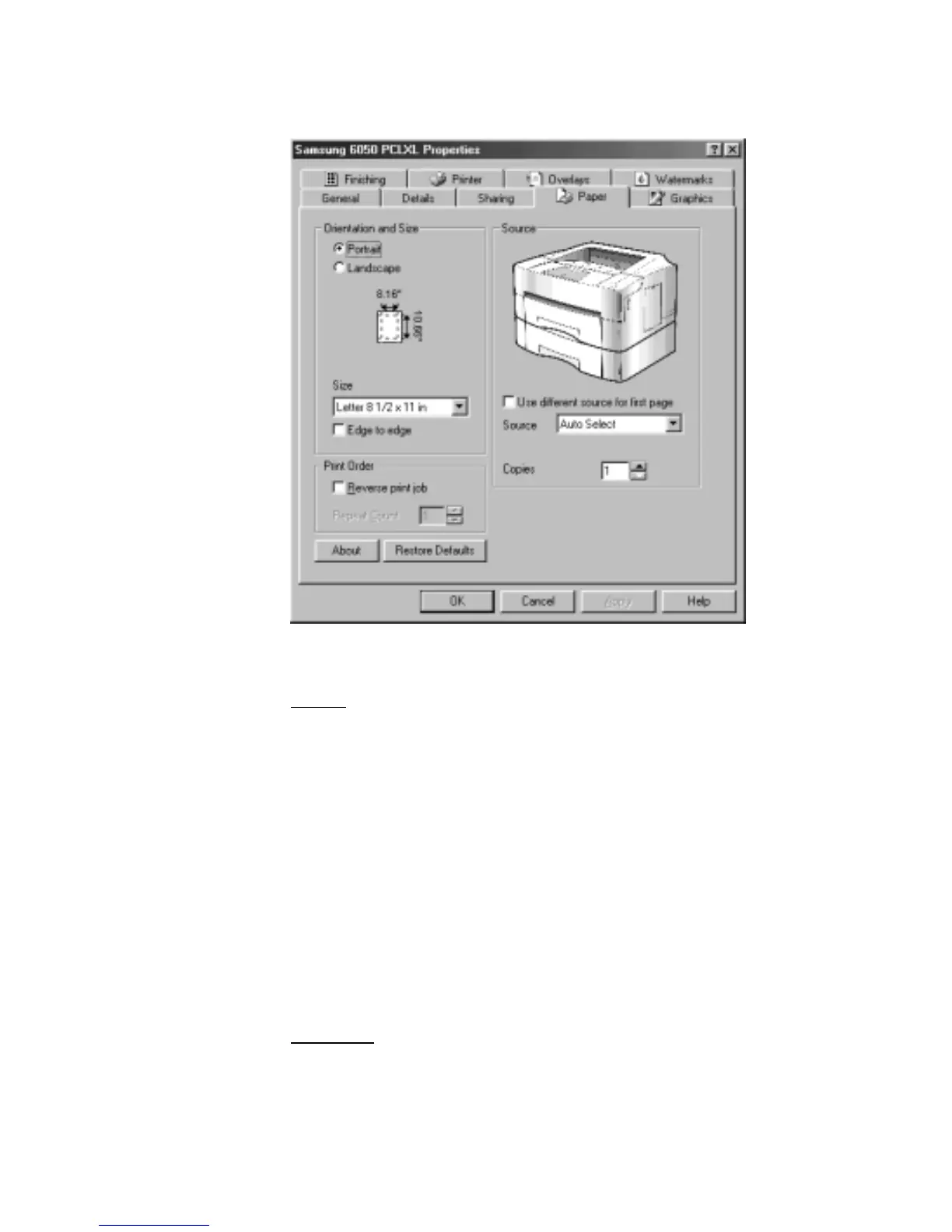 Source setting identifies the default paper source. Option Cassette