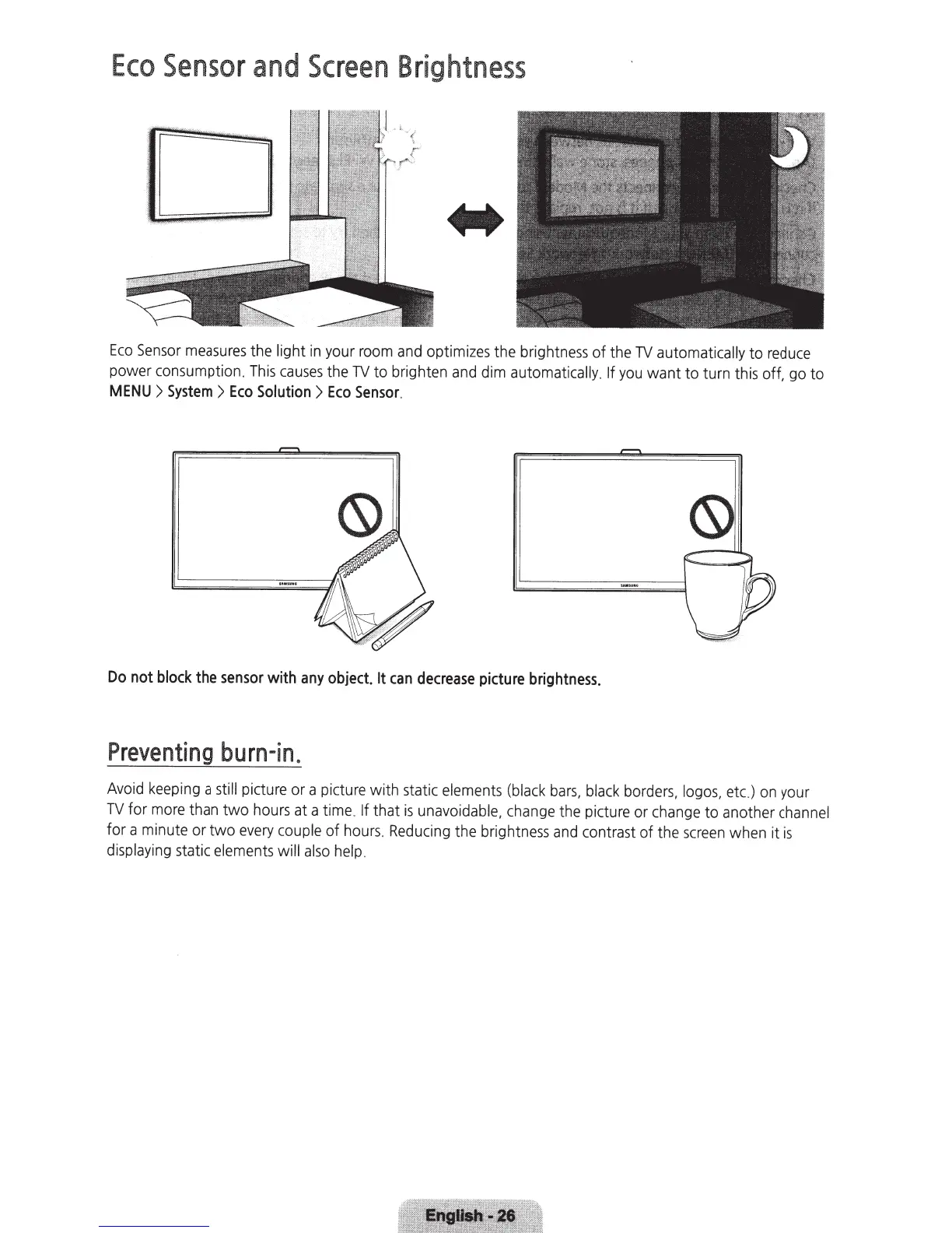 Samsung 6400 - Eco Sensor and Screen Brightness; Preventing burn-in