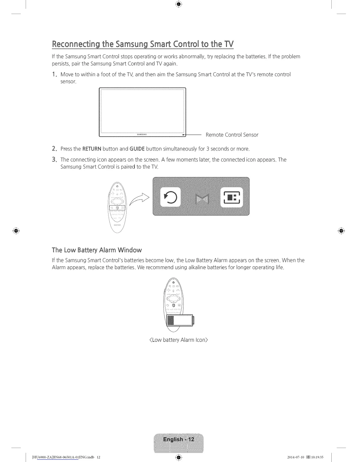 If the Samsung Smart ControPs batteries become low. the Low Battery Alarm appears on the screem When the