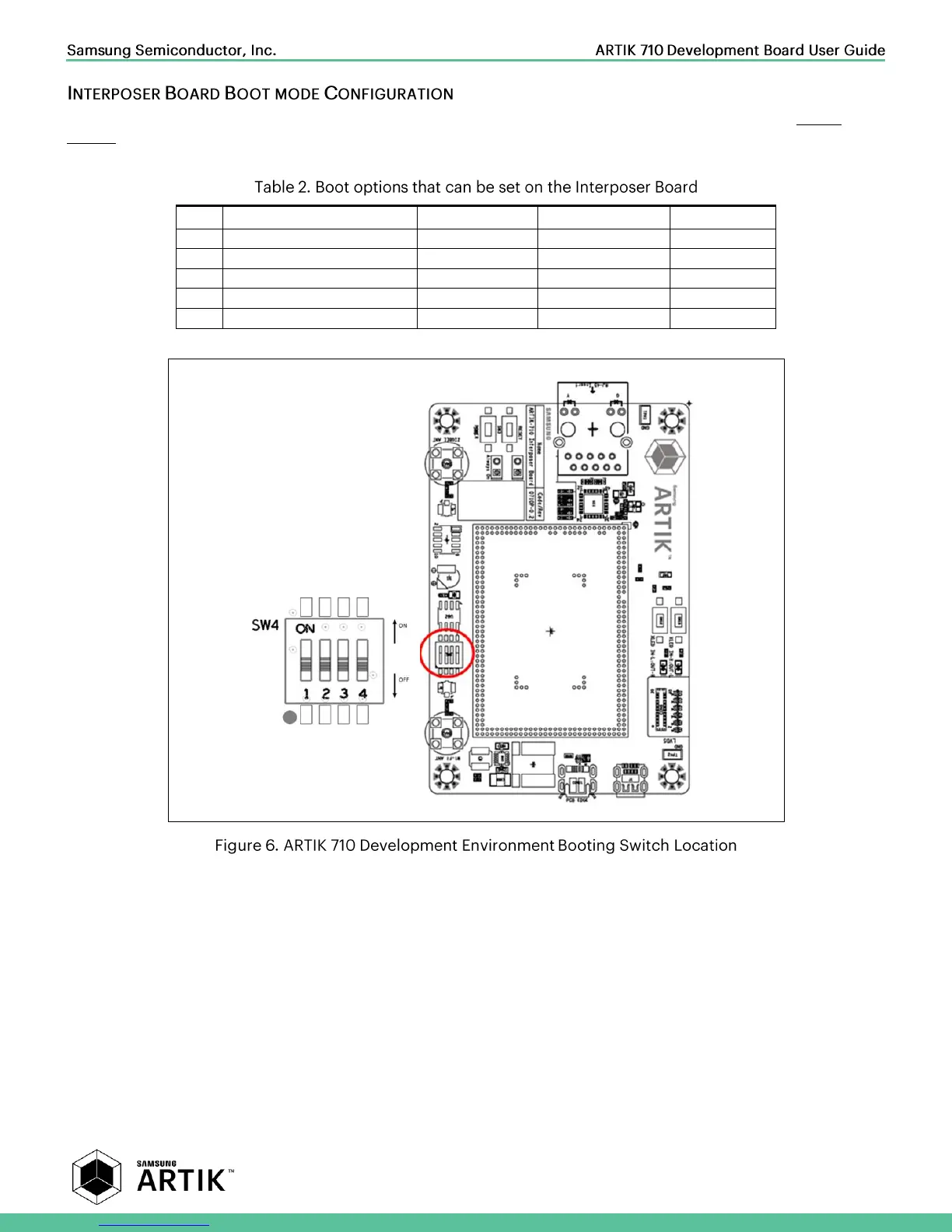 Figure 6 show how to manipulate SW4 and where SW4 is located on the Interposer Board to set the various booting options
