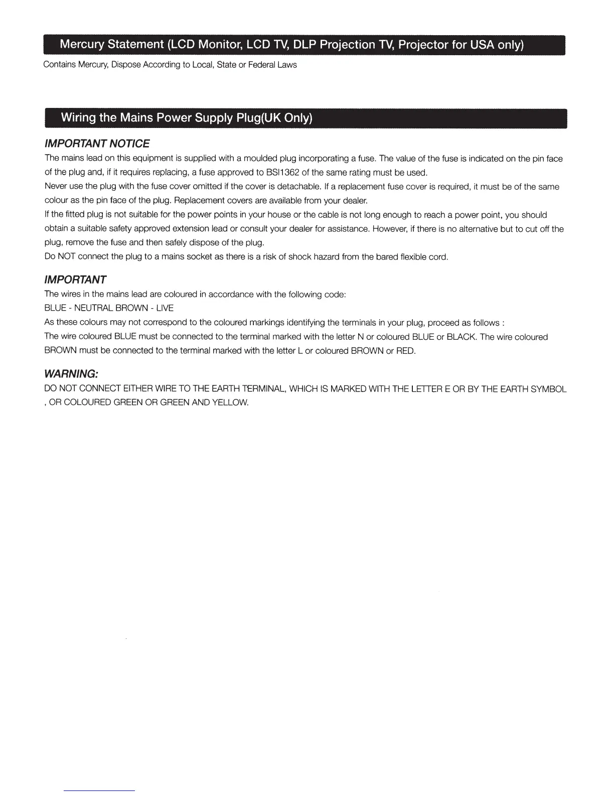 supplied with a moulded plug incorporating a fuse. The value of the fuse is indicated on the pin face