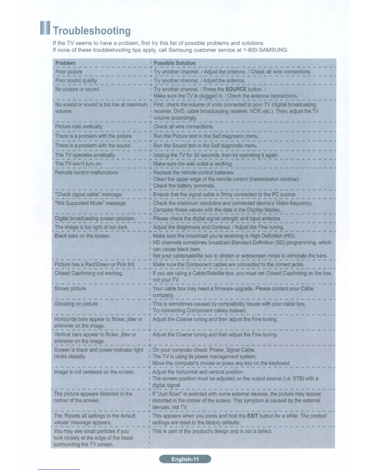these troubleshooting tips apply, call Samsung customer service at 1-BOO-SAMSUNG.