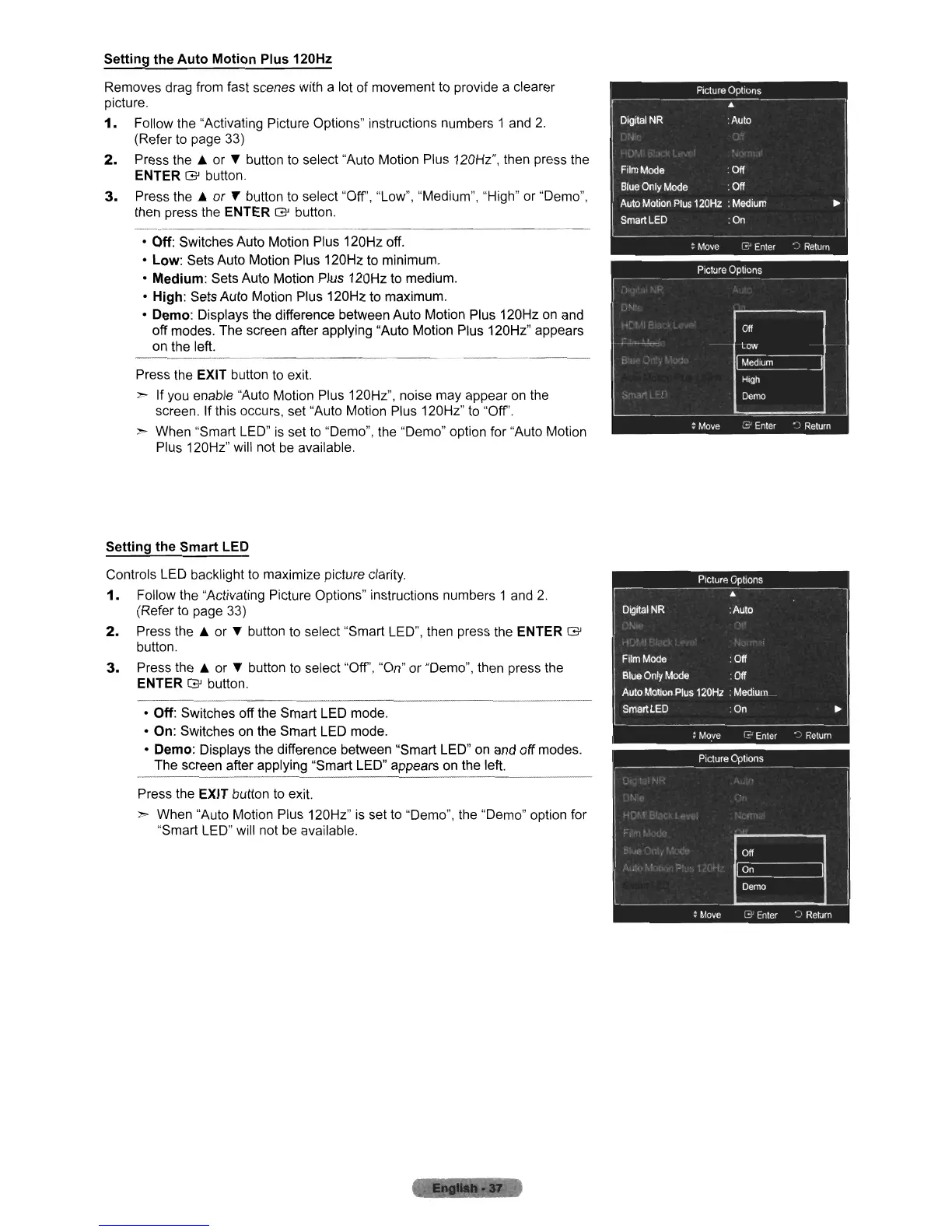 screen. If this occurs, set "Auto Motion Plus 120Hz" to "Off'.