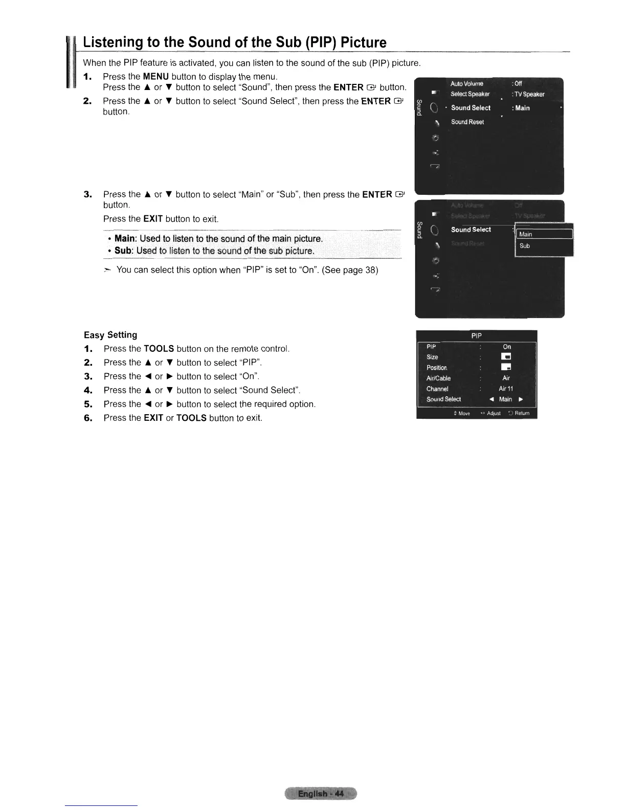 When the PIP feature is activated, you can listen to the sound of the sub (PIP) picture.