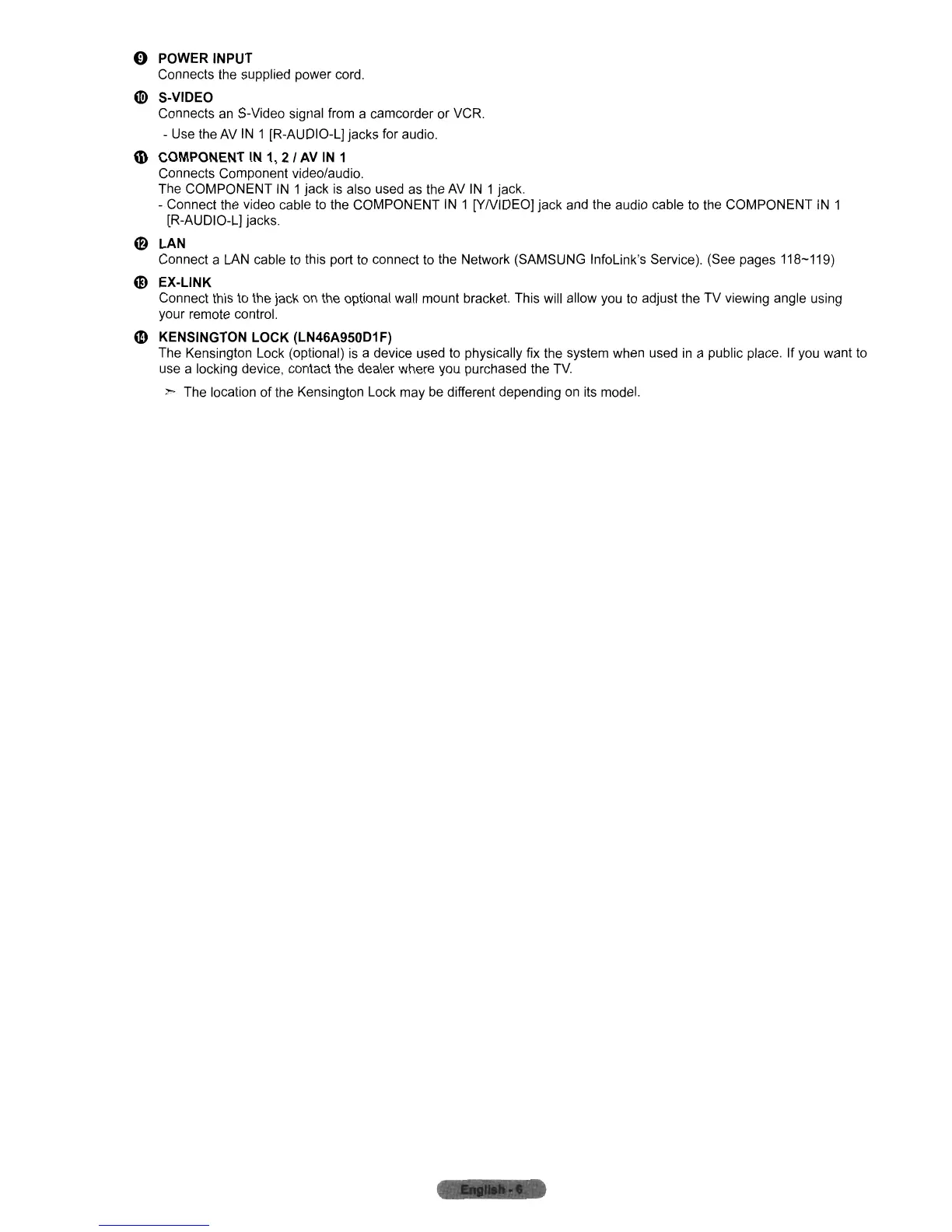Connect a LAN cable to this port to connect to the Network (SAMSUNG InfoLink's Service). (See pages 118-119)