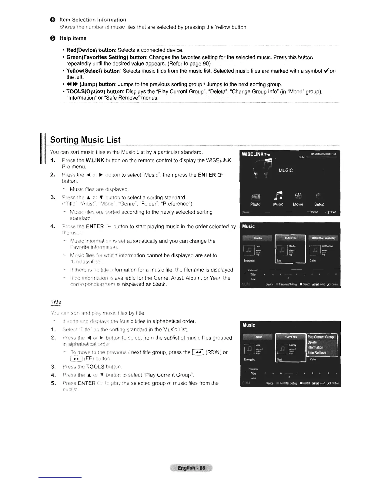 • Green(Favorites Setting) button: Changes the favorites setting for the selected music. Press this button