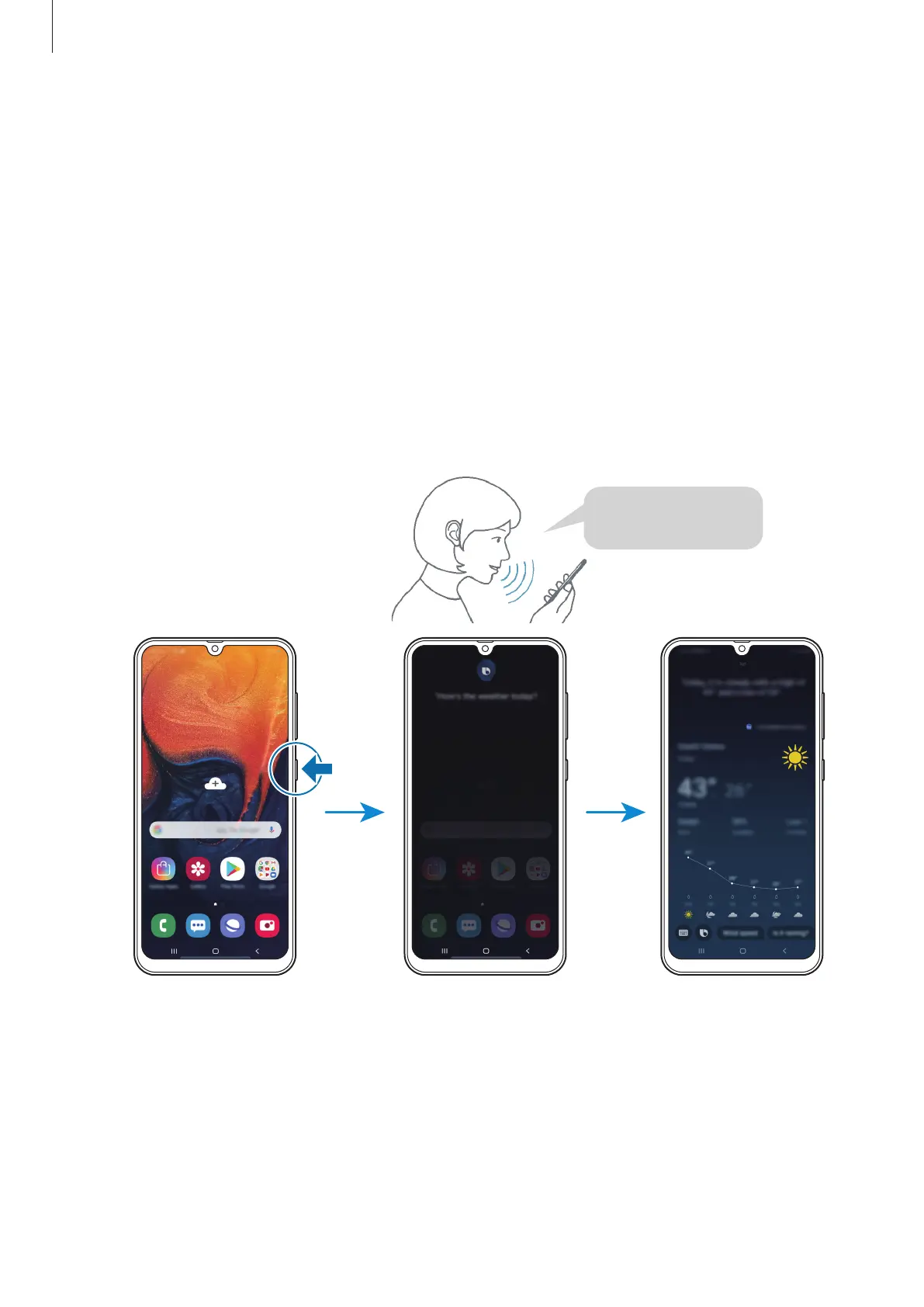 For example, while pressing and holding the Power key, say “How’s the weather today?” The