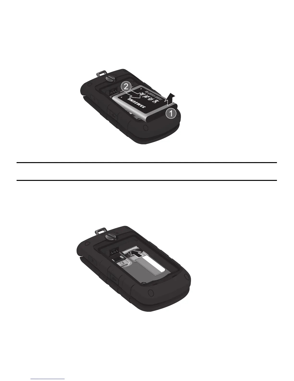 Lift the battery up (1) and away (2) from the phone, as shown.