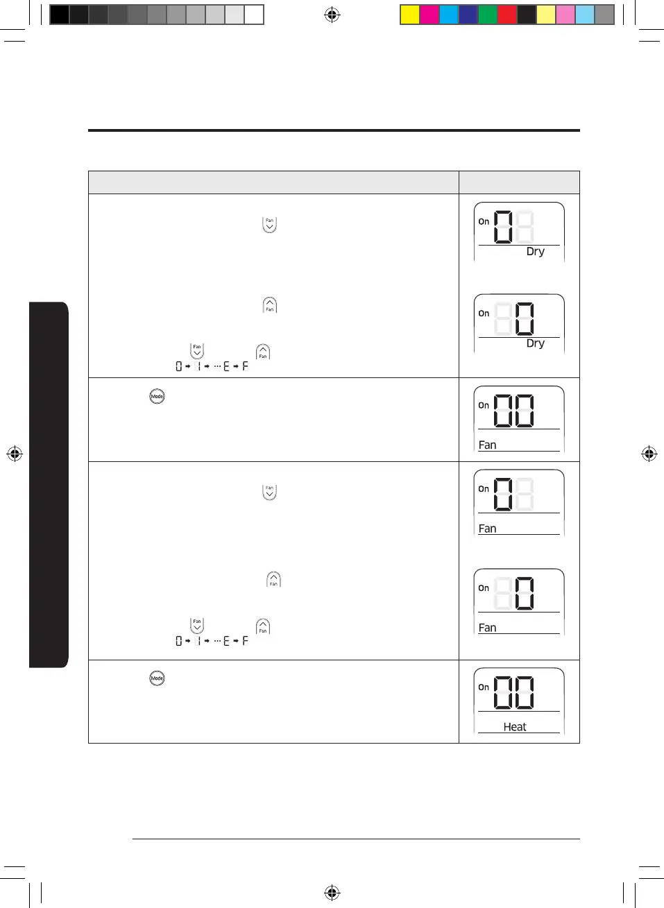6. Press the (Mode) button. Fan and On appear on the remote control display.