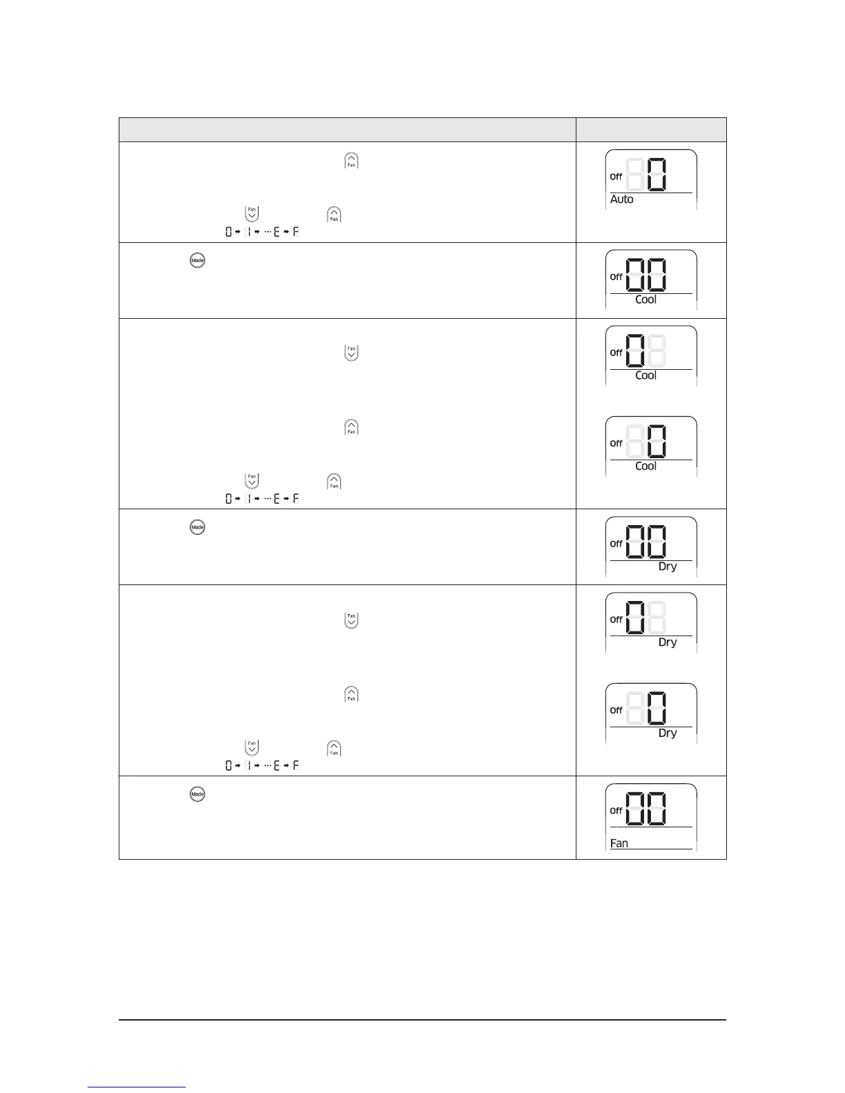 5 Press the (Mode) button. Fan and Off appear on the remote control display.