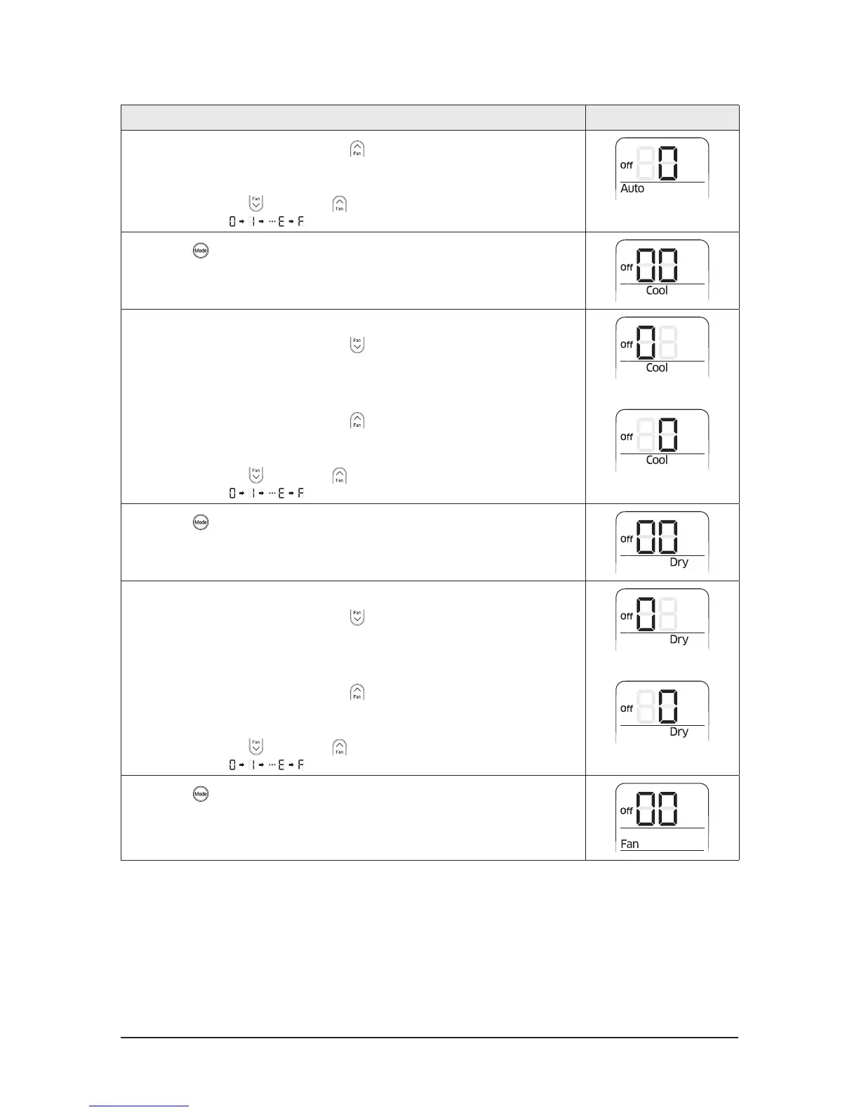 5 Press the (Mode) button. Fan and Off appear on the remote control display.